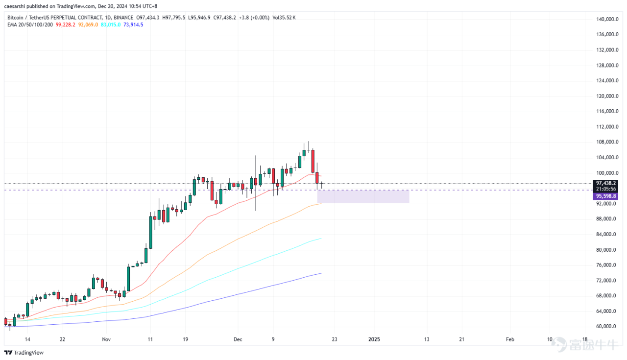 在比特幣突破108K,站上歷史新高價格後,就開始持續下跌,截止今日中午12點,已經有5000多點的跌幅。根據Coinglass的數據來看,過去的24小時裡有3.93億美金的倉位被清算。在這裡需要提醒大家,牛市期間,加密貨幣的投資仍要以現貨為主,盡量少參與衍生品市場,雖然總體趨勢向上,但是莊家會不斷向下獵取流動性,風險很大。