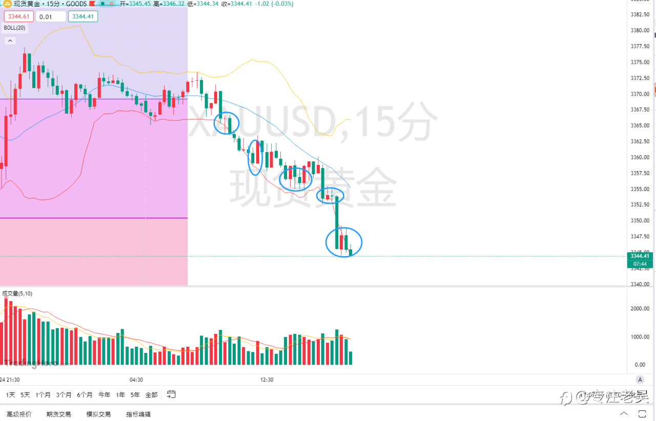 上周四美盘3361空单仍持有中,看3260/3200,早盘跳空低开已达第一目标3260,老吴暂时减仓利润落袋,留半仓继续看3200