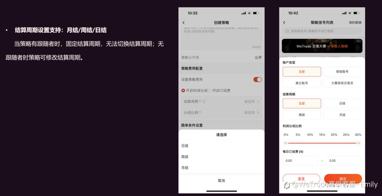 2.跟单社区的利润分成策略结算周期由仅支持月结升级为支持月结,周结,日结,让客户拥有更多选择。