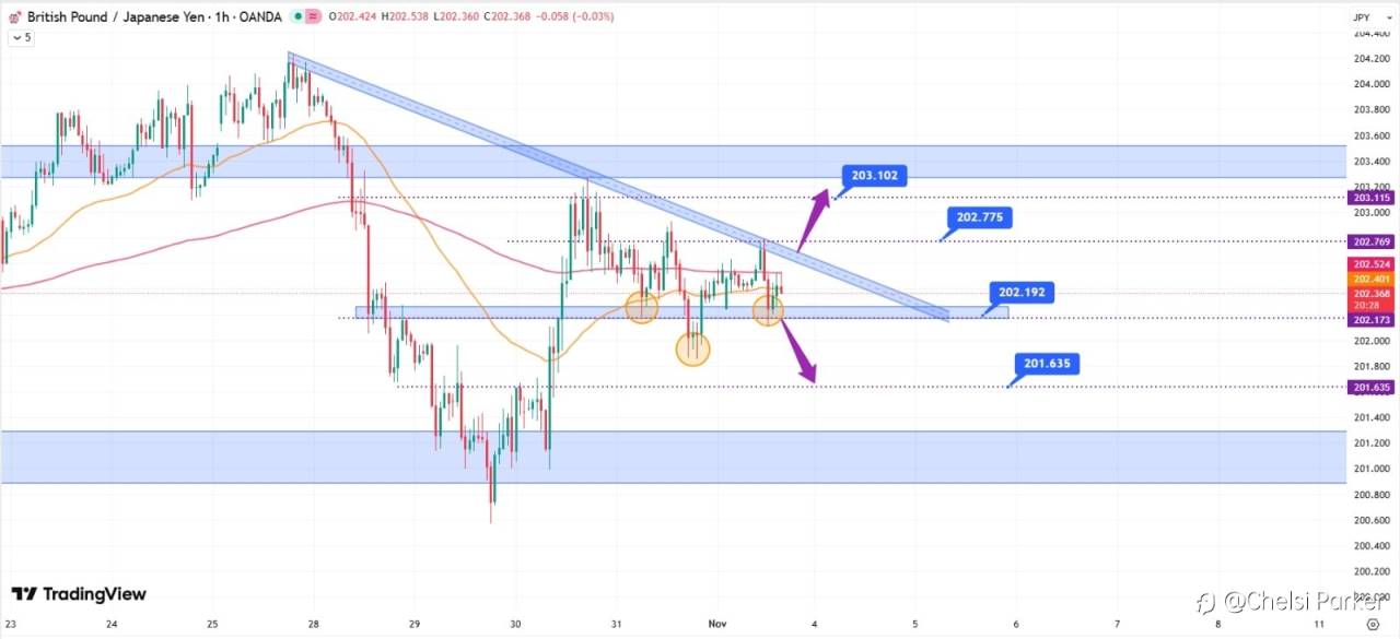 GBP/JPY remains capped below trendline resistance near 203.00, with downside risk building if 202.20 support gives way.