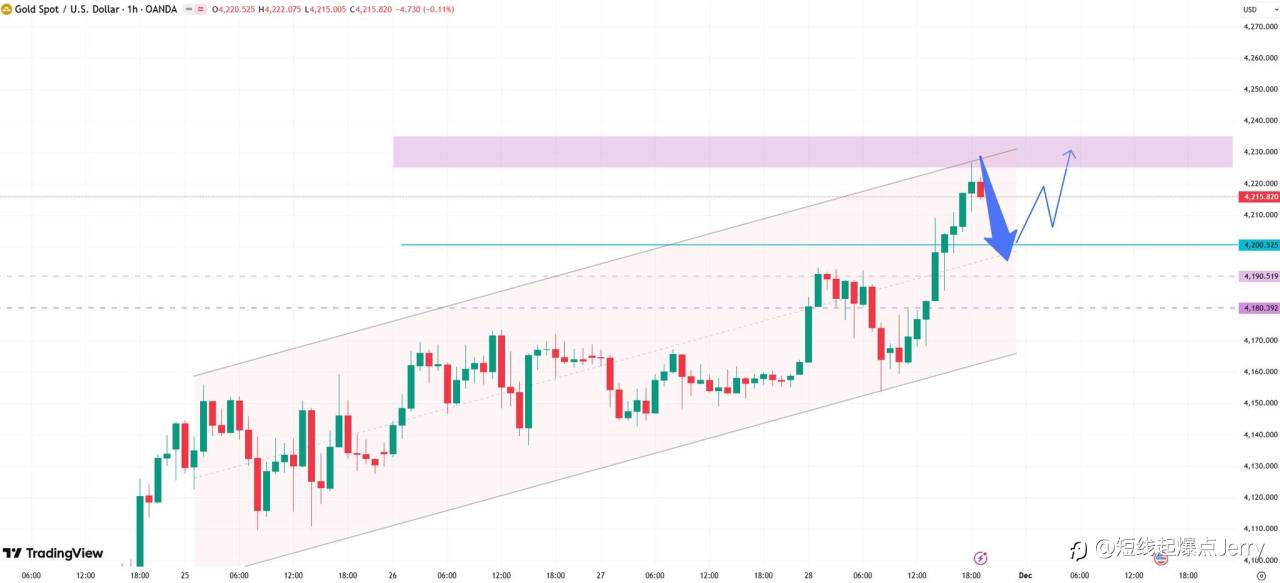 #XAU/USD# 从1H线图,黄金已再突破4200位置大关,并在4215位置附近波动,显示出强劲的上涨势头收盘。