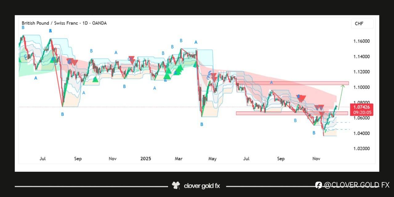 The GBPCHF 14H chart is showing a strong corrective structure where price has respected the major support zone and is now pushing upward with increasing bullish momentum. After completing a clear five-wave decline into support, the pair formed an A-B corrective base, signaling the start of a potential wave C recovery. Buyers stepped in aggressively at support, and the current upward move suggests that the market is aiming toward the next resistance zone where the larger wave (iv) is expected to complete. If bullish strength continues, price may climb toward the highlighted resistance area, completing the projected C wave before any major reversal or continuation decision is made. This structure reflects a classic Elliott Wave correction with well-defined support, resistance, and impulse-correction sequencing.