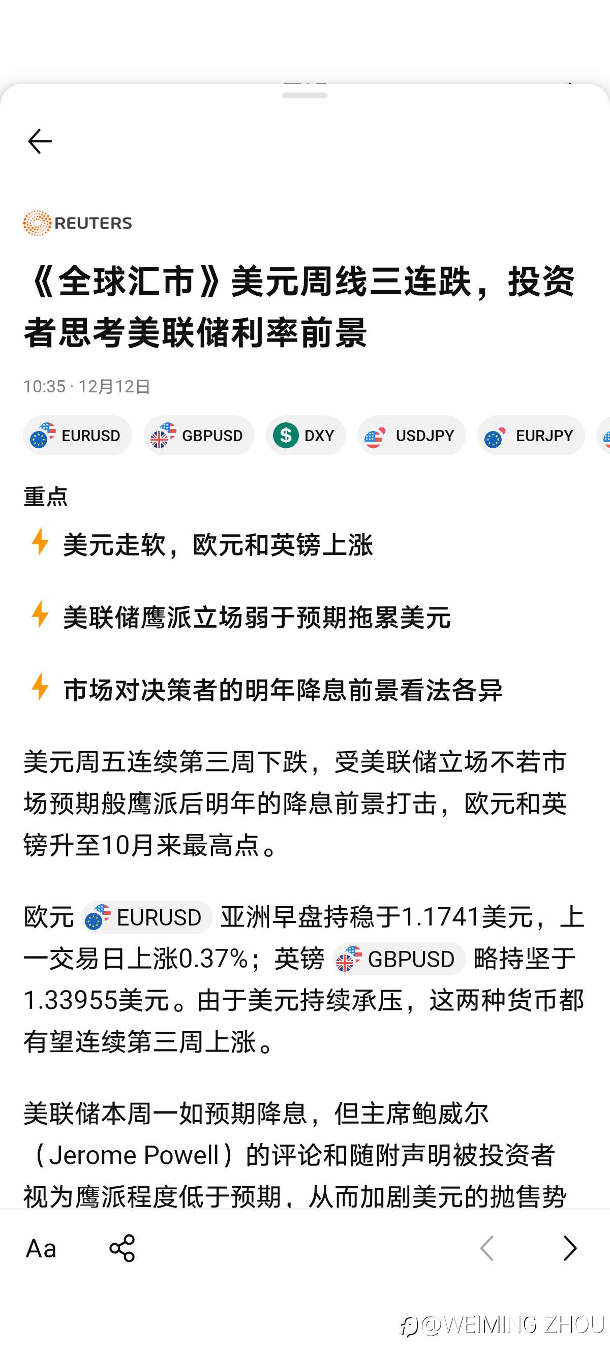 《全球汇市》美元周线三连跌,投资者思考美联储利率前景