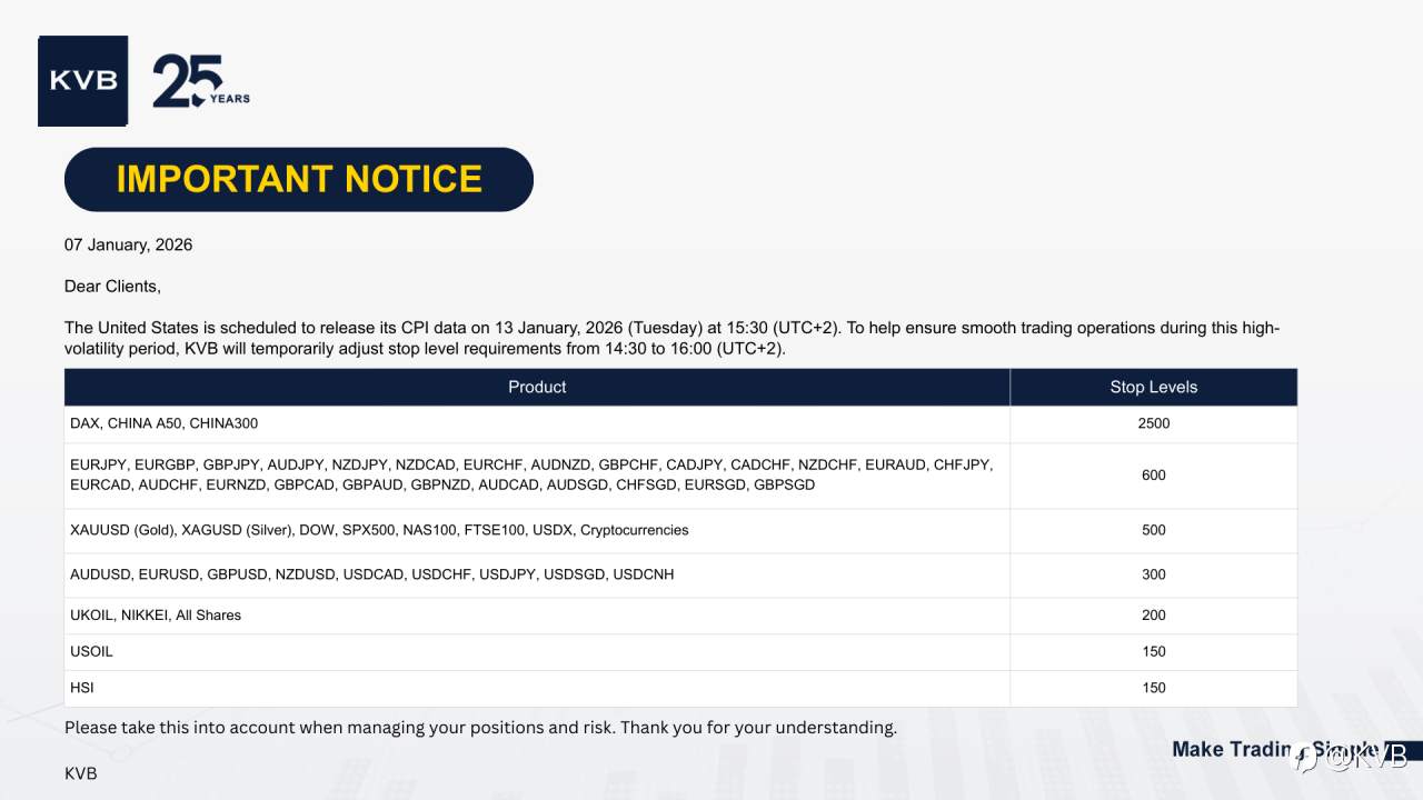 To ensure smooth trading operations during the data release period, KVB will temporarily adjust stop level requirements from 14:30 to 16:00 (UTC+2).