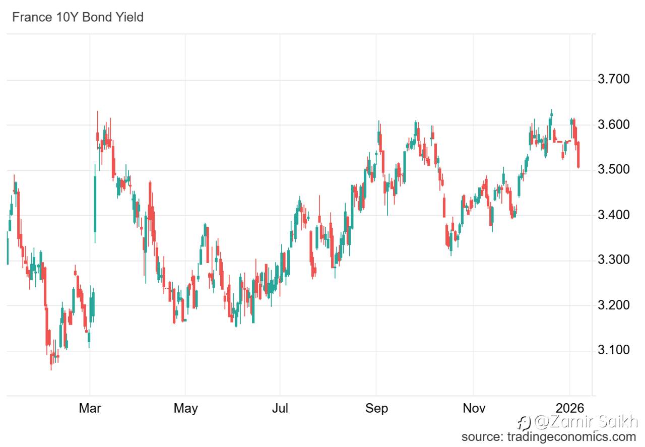 France 10Y OAT Yield Slides to 1-Month Low 📉 France’s 10-year OAT yield fell toward 3.5% as softer inflation data reinforced ECB easing expectations. Investors also remain cautious amid budget uncertainty and record debt issuance plans. Key Points: • Eurozone inflation eases to 2%, core at 2.3% • France CPI at 0.7% YoY, below expectations • Focus on €310bn debt issuance & budget talks #bonds# #Eurozone# #Inflation# #ECB# #market# #update#