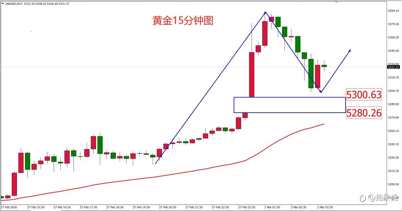 技术面上,由于基本面的影响,技术面结构混乱。大家关注两个重点,一个是下方的跳空缺口,这个缺口在5280-5300附近。一个是上方的高点,点位在5393附近。如果向上突破,多头会强势回归。如果回补缺口,多头避险行情可能就结束了。中间的这段震荡,可以选择观望, 以安全为主。