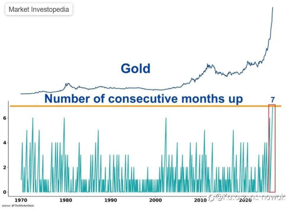 Gold has now risen for seven consecutive months, marking the longest winning streak on record. During this rally, prices have surged 61%, averaging nearly 9% monthly gains.