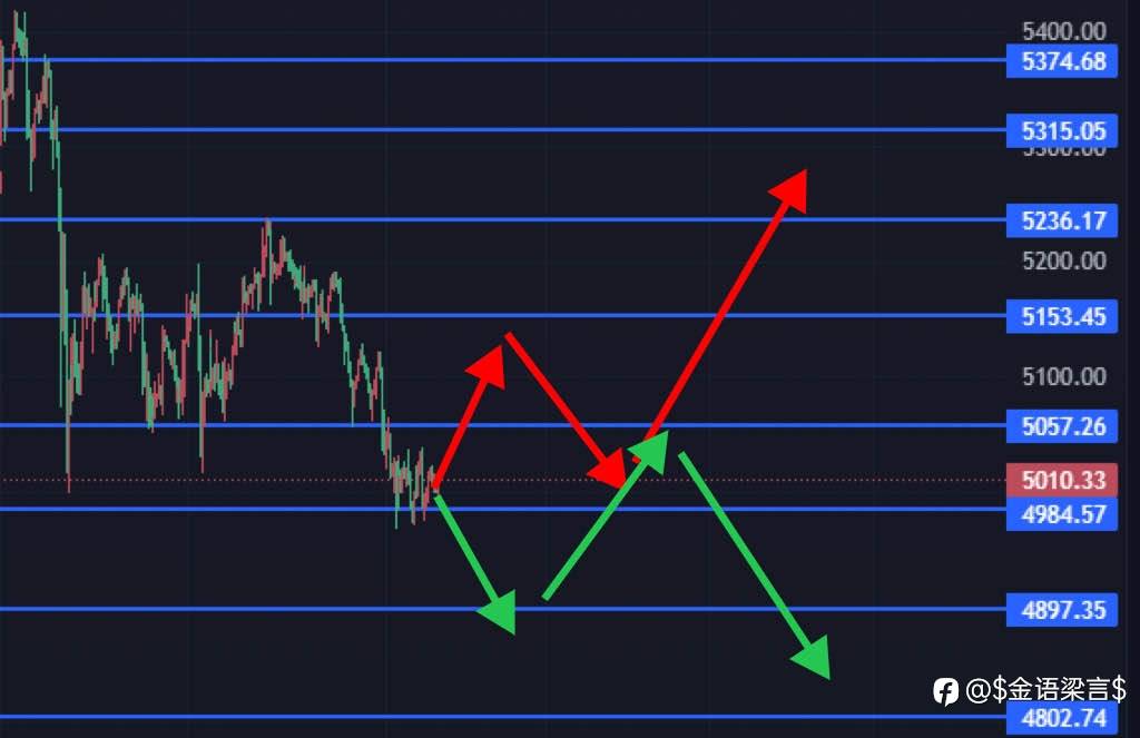 日内策略思路:早盘接周五分析如期下拉,现价多单入场目前减持中,5106亚欧多空分界线,上破多头开启,不破下方4980会到。