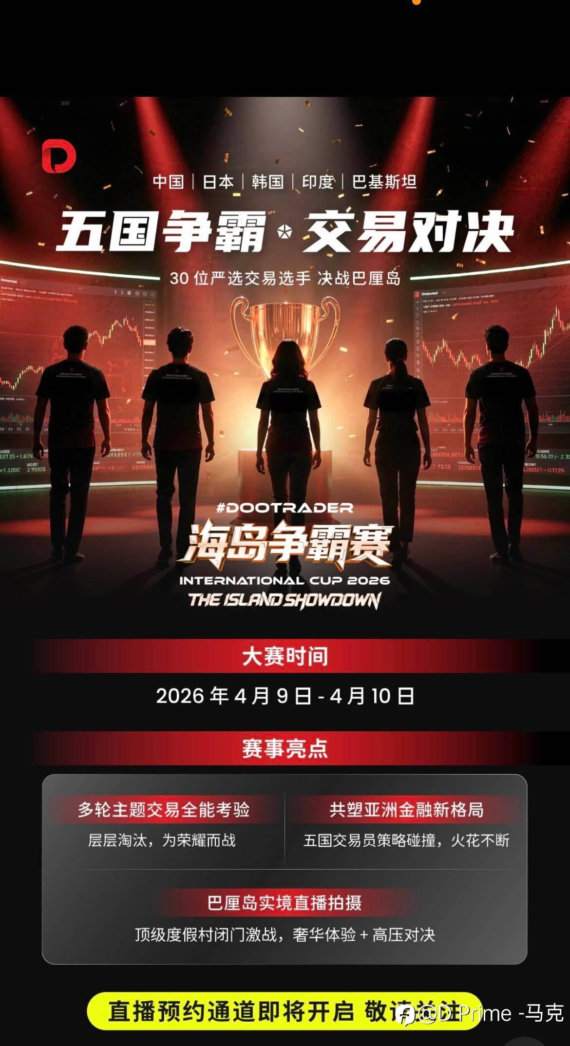 2026 年 4 月 9 日-10 日,D Prime 首个实盘交易竞技直播秀登场!共赏中国、日本、韩国、印度、巴基斯坦五国高手博弈,见证百万冠军诞生!锁定直播,更有观赛专属红包同步放送!🧧