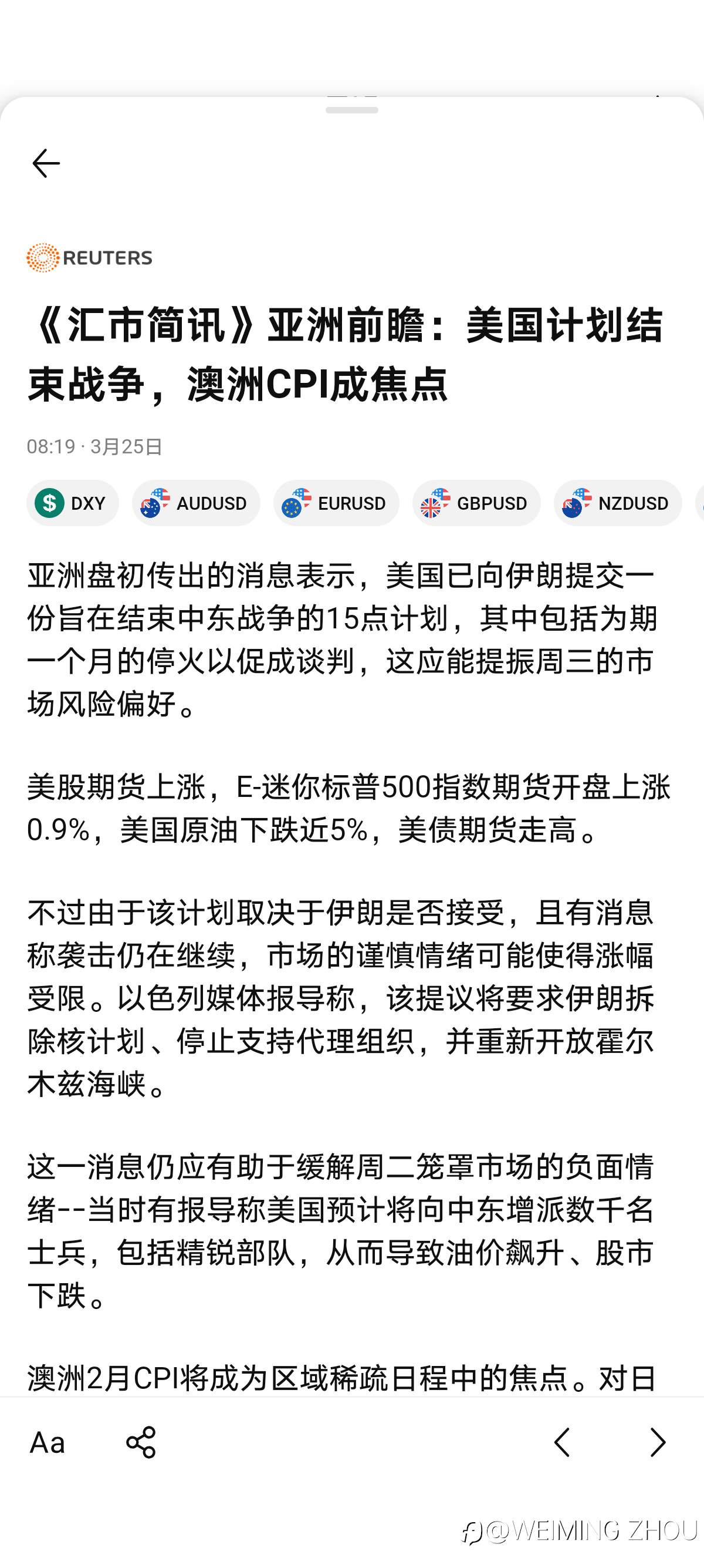 《汇市简讯》亚洲前瞻:美国计划结束战争,澳洲CPI成焦点