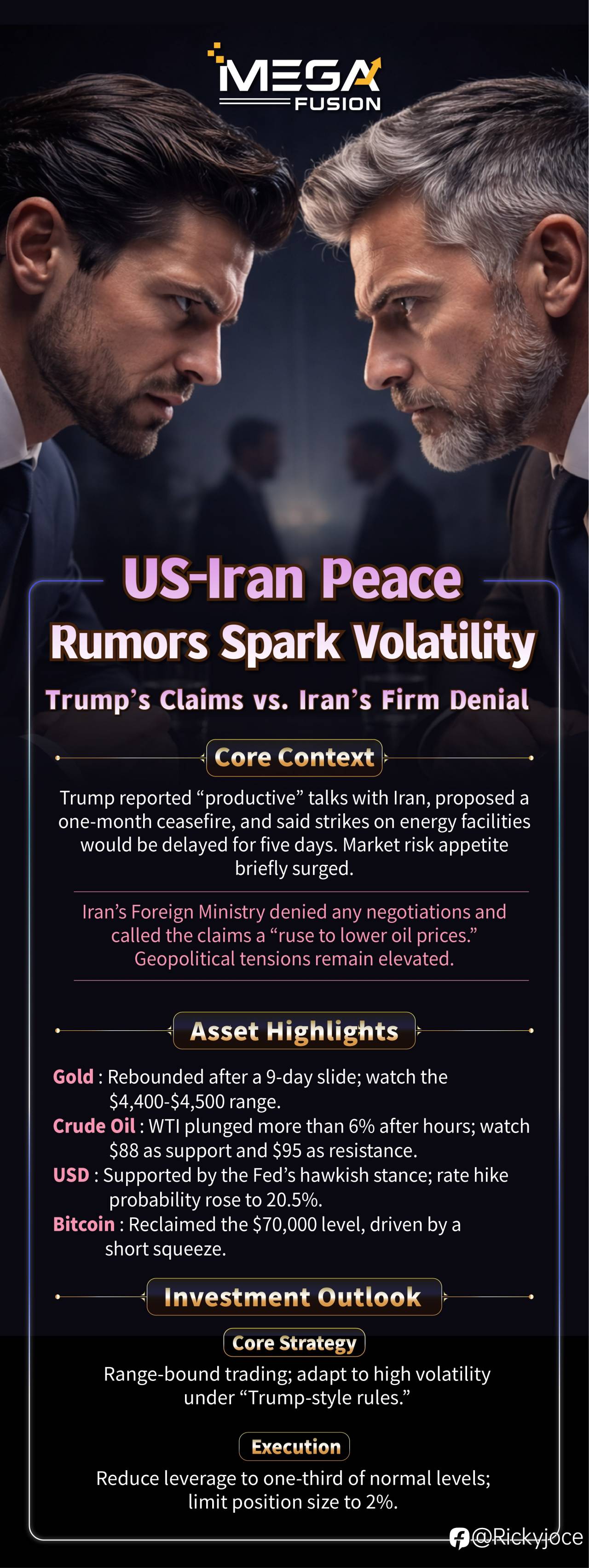 While one side talks peace deals, the other issues stern denials, leaving traders caught in the middle of massive swings in gold, oil, and bitcoin.