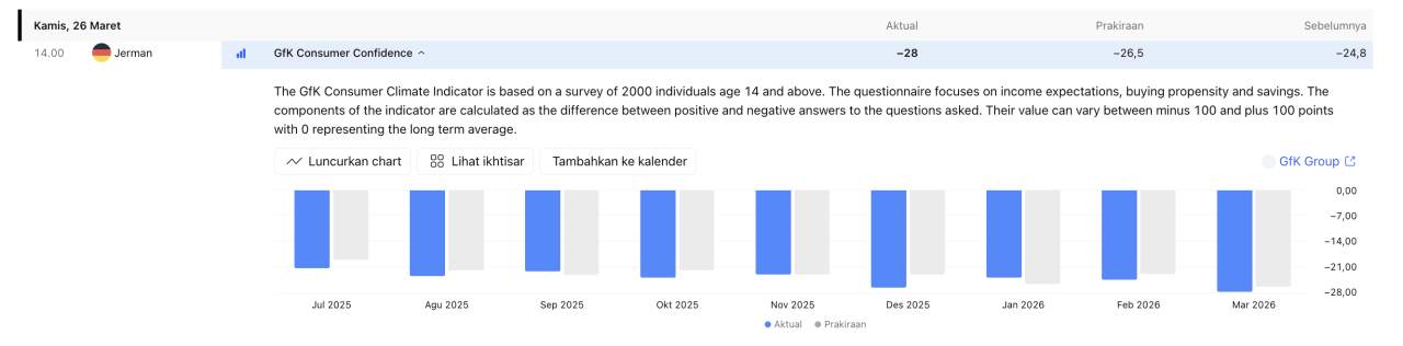 Data GfK Consumer Confidence Jerman barusan keluar, hasilnya turun ke -28, lebih buruk dari forecast -26.5 dan sebelumnya -24.8.