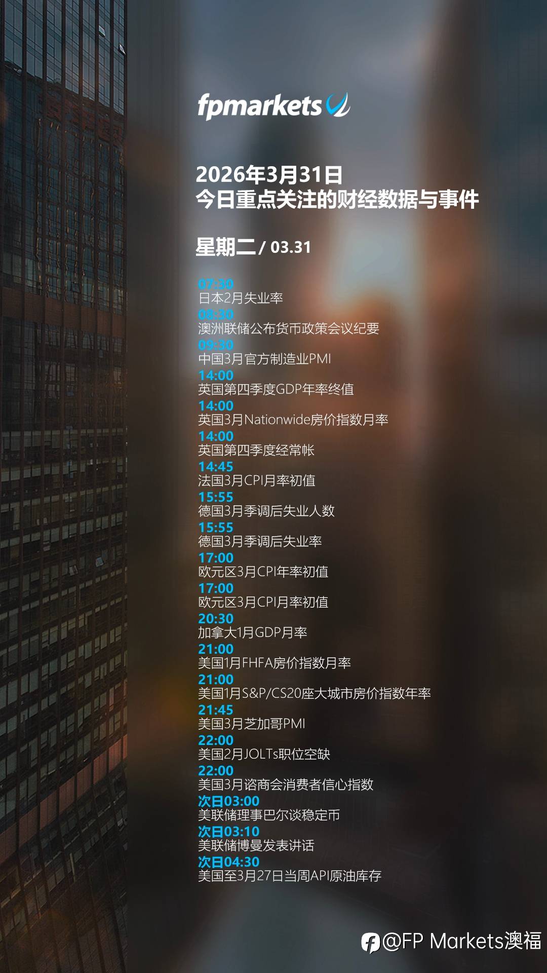 【FPMarkets今日重点关注的财经数据与事件:2026年3月31日 周二】