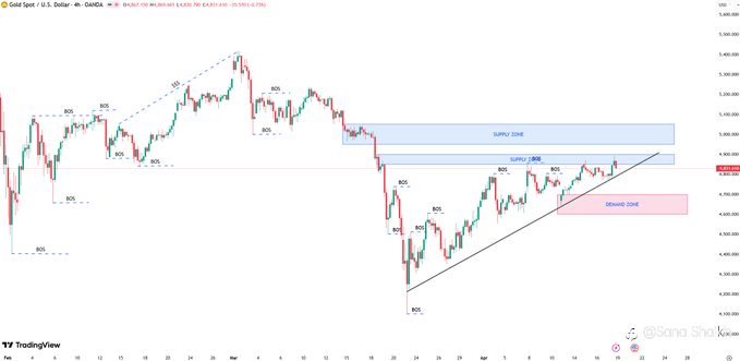 Gold Technical Structure: Strong Bearish Candle on Weekly, Bearish Flag on Daily, Trading Above 20SMA on Daily, Bearish Flag on 4H, Consolidation on 1H