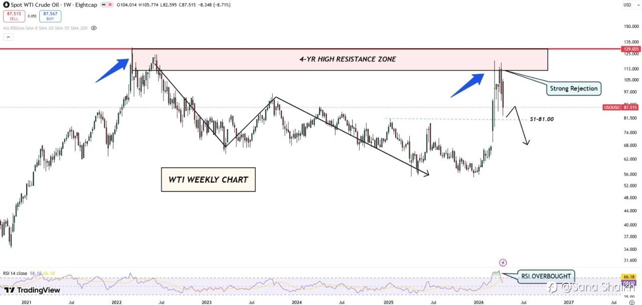 WTI crude faces a strong rejection at the 4-year resistance zone (~120–125), signaling exhaustion after the recent spike.