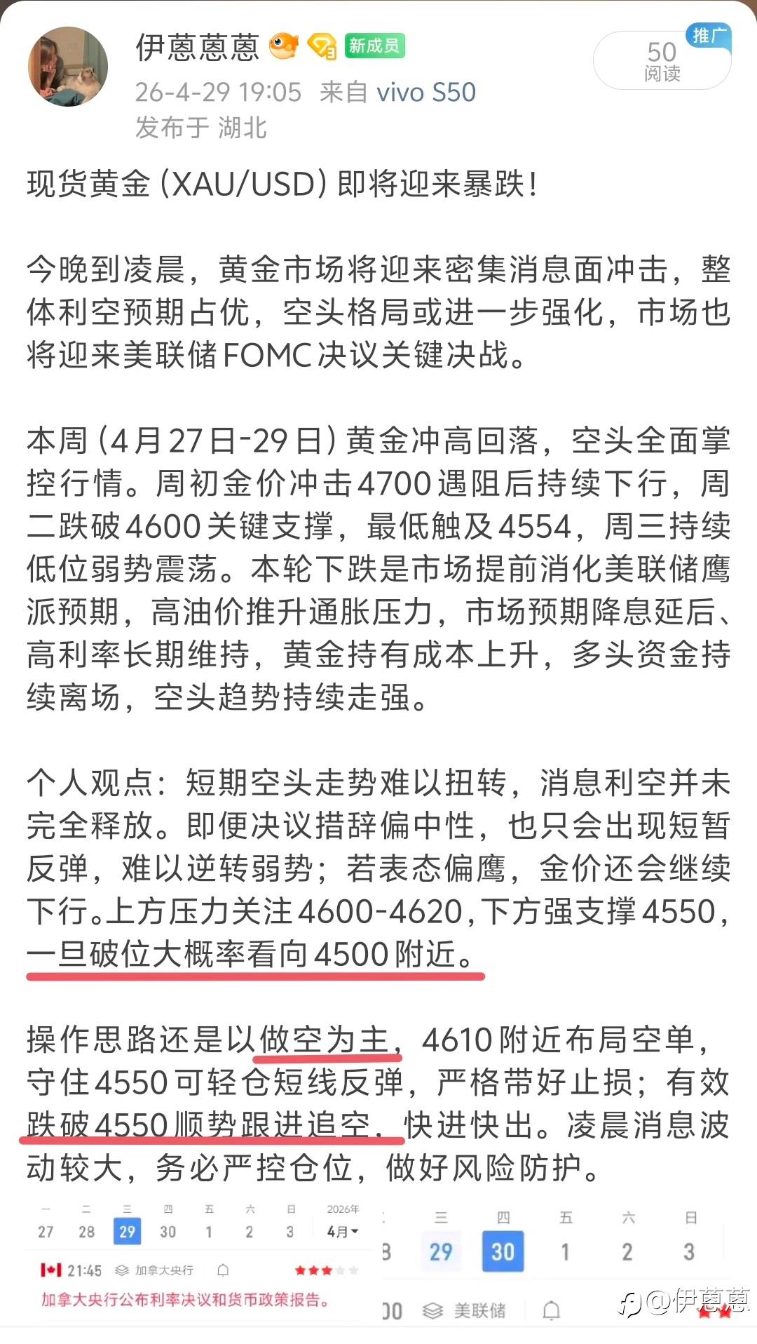 个人观点:短期空头走势难以扭转,消息利空并未完全释放。即便决议措辞偏中性,也只会出现短暂反弹,难以逆转弱势;若表态偏鹰,金价还会继续下行。上方压力关注4600-4620,下方强支撑4550,一旦破位大概率看向4500附近。
