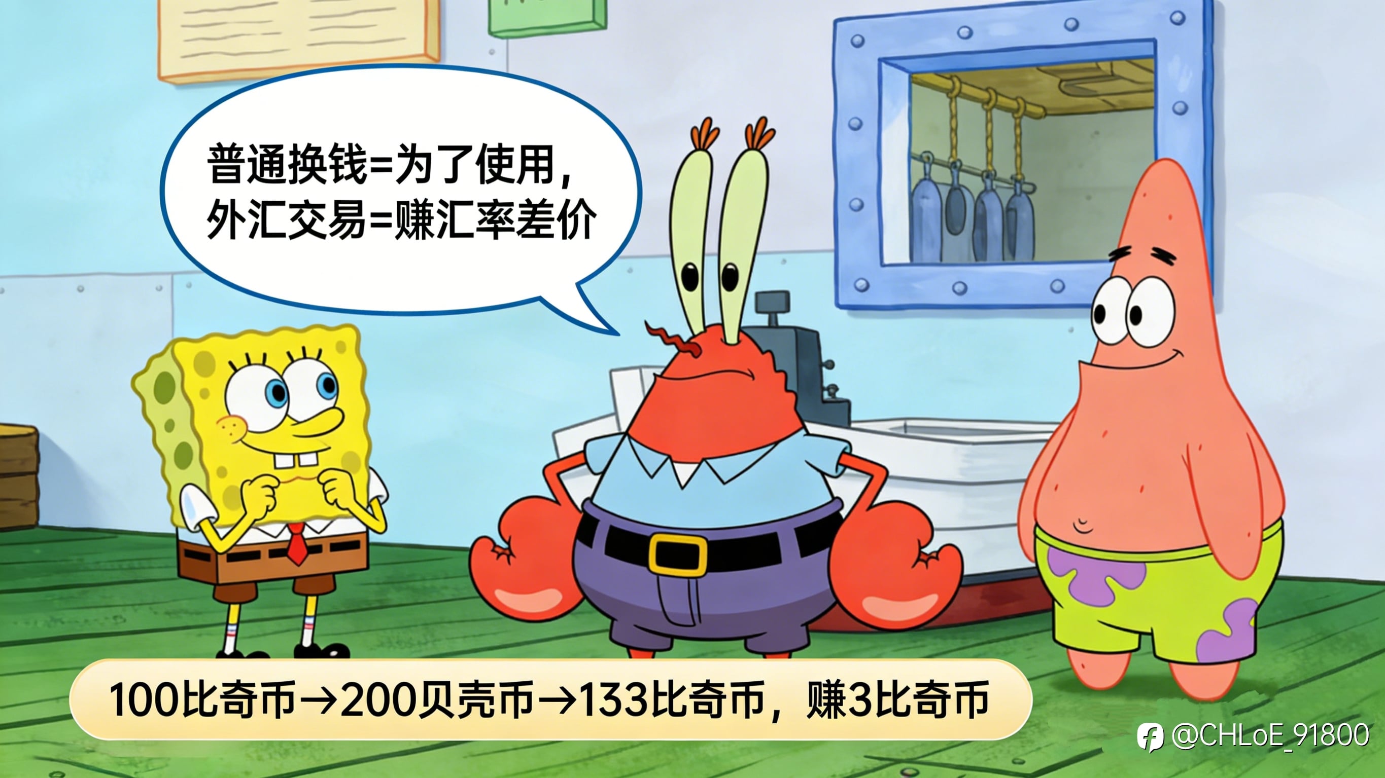 海绵宝宝靠汇率赚过钱,也因汇率亏过钱,他渐渐发现,比奇堡里越来越多小伙伴在“换钱”中寻找赚钱机会,蟹老板告诉他,这种“靠兑换不同小镇货币、利用汇率变化赚钱”的行为,其实就是外汇交易。 海绵宝宝一脸疑惑:“外汇交易不就是换钱吗?和我之前换贝壳币、海星币有什么不一样?” 蟹老板笑着解释:“普通换钱是为了买东西、用东西,比如你换贝壳币买玩具,派大星换海星币买棒棒糖,这是‘使用型兑换’;而外汇交易,核心是‘赚钱’,换钱不是为了用,而是为了等汇率变了,再换回来赚差价,就像你之前靠比奇币和贝壳币的汇率变化赚钱,就是最简单的外汇交易。” 为了让海绵宝宝更明白,蟹老板举了个例子:“比如你手里有100个比奇币,