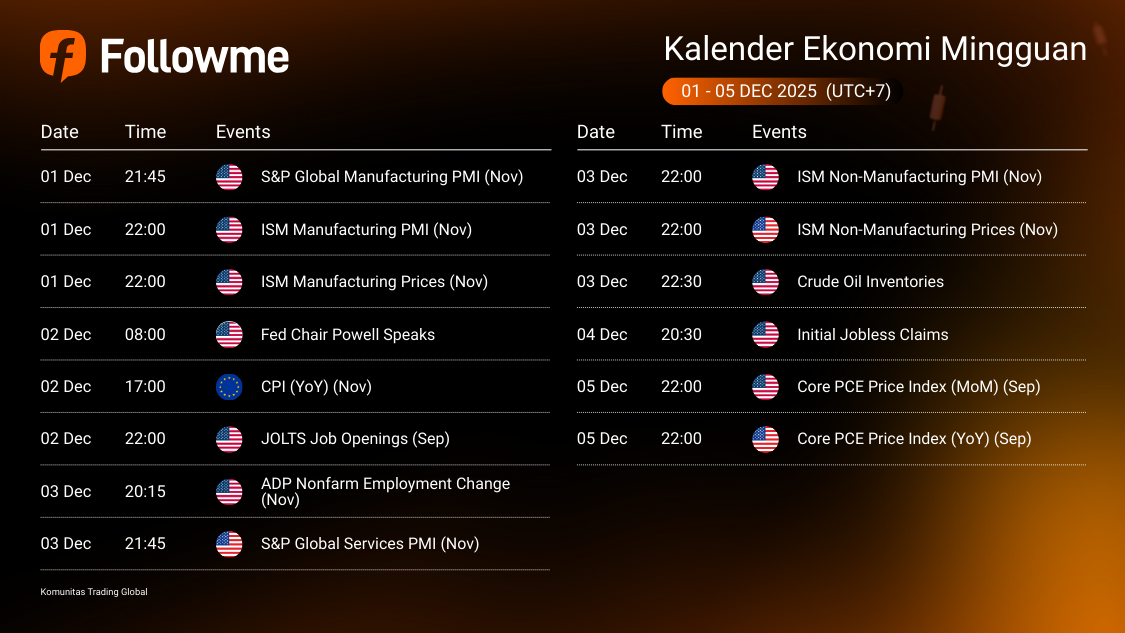 Kalender Ekonomi: 1 - 5 Desember 2025 Minggu ini pasar akan fokus pada data inflasi, tenaga kerja, dan sektor manufaktur dari AS serta rilis CPI dari Eropa. Pergerakan USD berpotensi meningkat terutama menjelang data tenaga kerja dan komentar Ketua The Fed. Pastikan perhatikan jam rilis untuk mengat