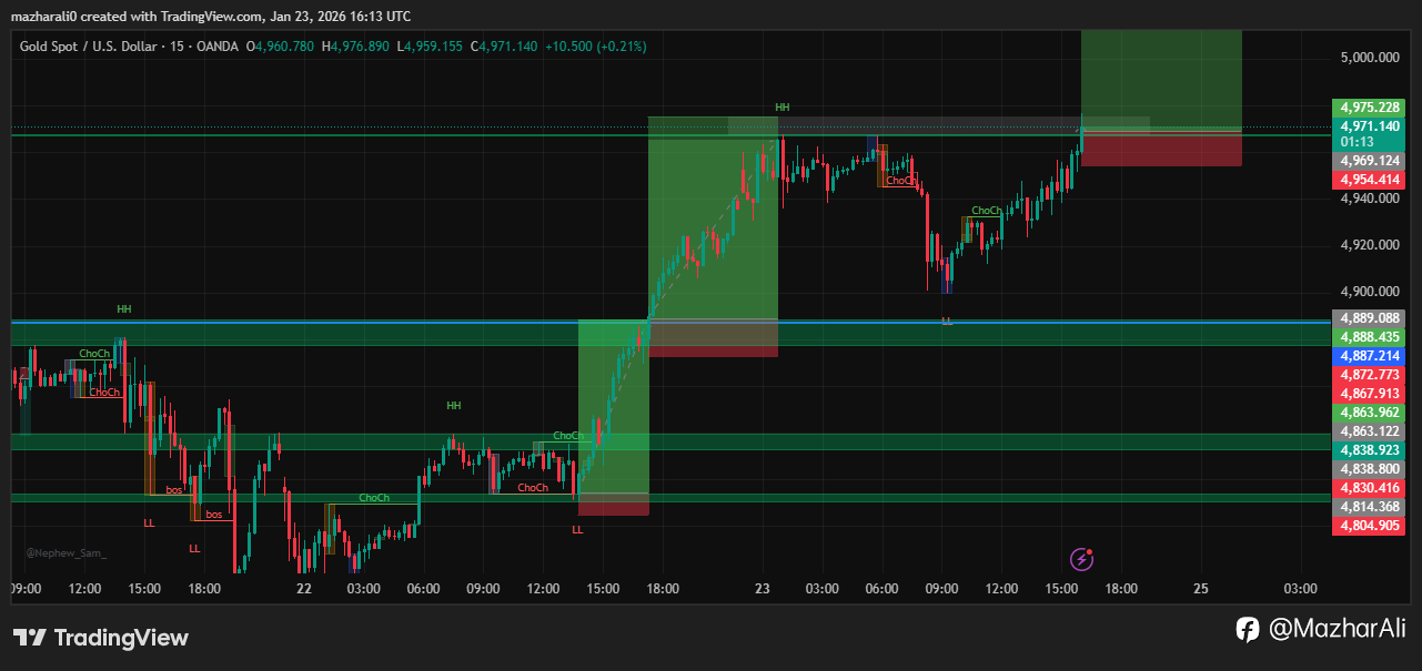 XAUUSD – Smart Money in Control 🧠📈 Gold respected structure perfectly today. 🔹 Market Structure Clear HH → HL sequence confirms bullish biasMultiple ChoCH → BOS signals showing smart money accumulationStrong displacement from demand = institutional intent 🔹 Key Levels Demand held around 4,880 –