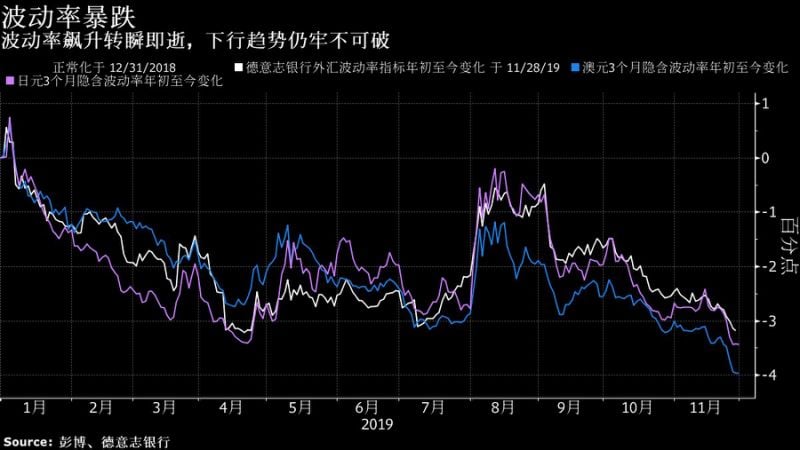 随着全球贸易层面取得进展,主要央行似乎不太可能调整政策,德意志银行衡量外汇市场预期波动的指标已连续三个月下降。在G10货币中,澳元波动率的下跌最为明显,3个月期的波动率指标跌至二十多年来的最低点。