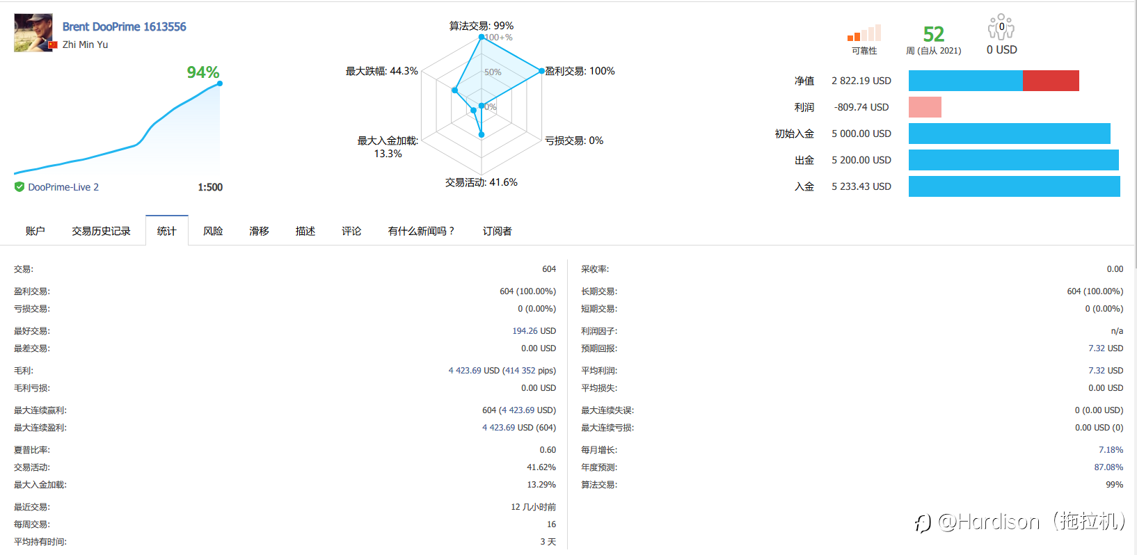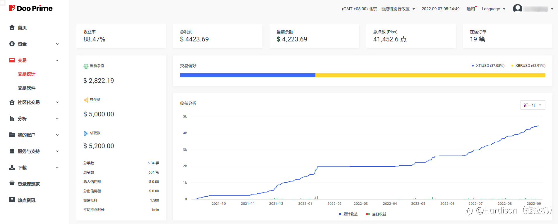 2021年9月7日,白天转5千美金开了新账户,也就是现在的#7号账户,当天晚上21点左右,比特币市场价格暴跌,算是躲过一劫。 徳璞平台商系统里记录,在MT4软件里,分别2次被删除300多笔历史成交单,并把删除之前的账户权益,记为入金性质,因此,被咱们社区系统错误读取有关数据,影响了7号账户的最大回撤数据、入金数据(出金数据是对的)。 总结下,无非就是,2021年9月7日,5千美金入金,在2022年1月份,取出5千美金,当时,剩下不到2千美金全是净利润在里面继续搞,在2022年4月份,再取出200美金,合计取出5200美金,当前,7号账户净值是2822美金,大家说说看,我的真实实际收益率是多少呢