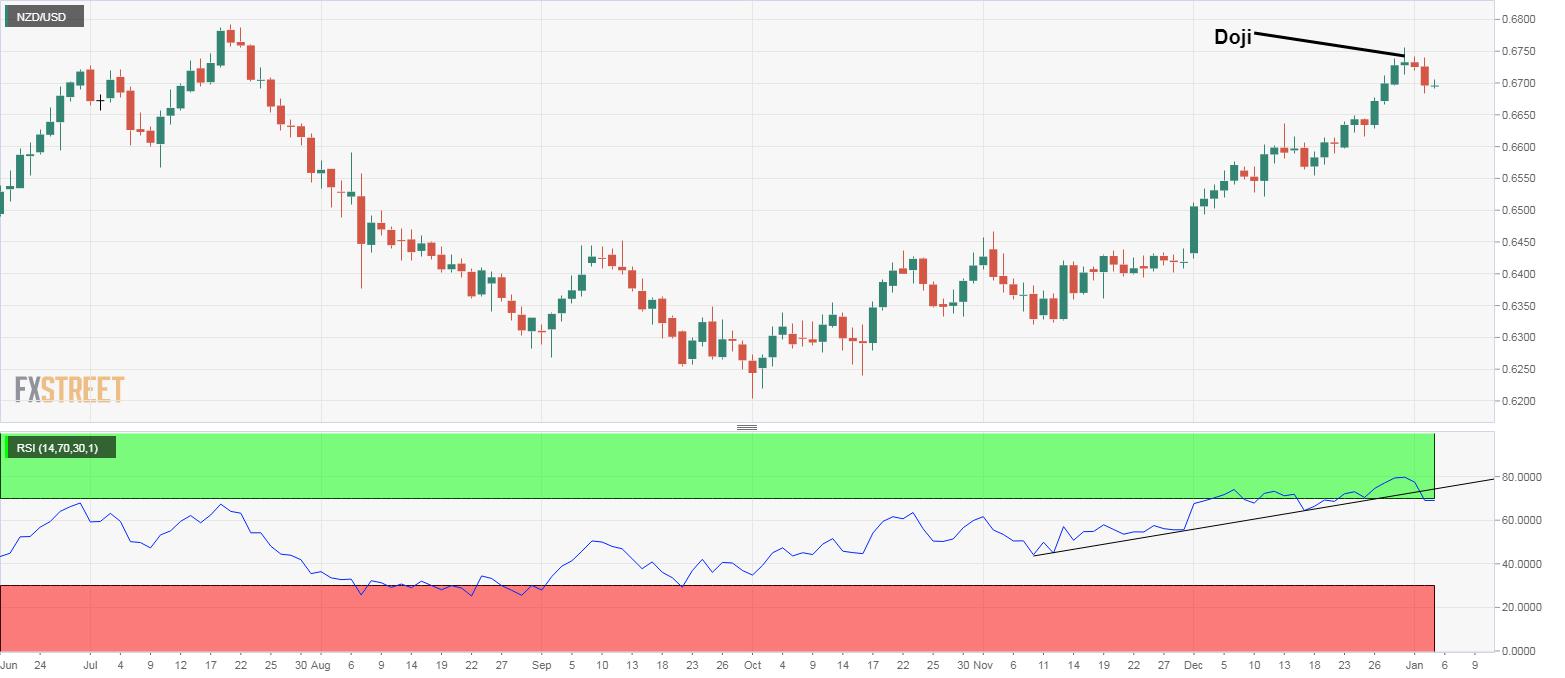 NZD/USD's daily chart is reporting a bearish Doji reversal pattern.