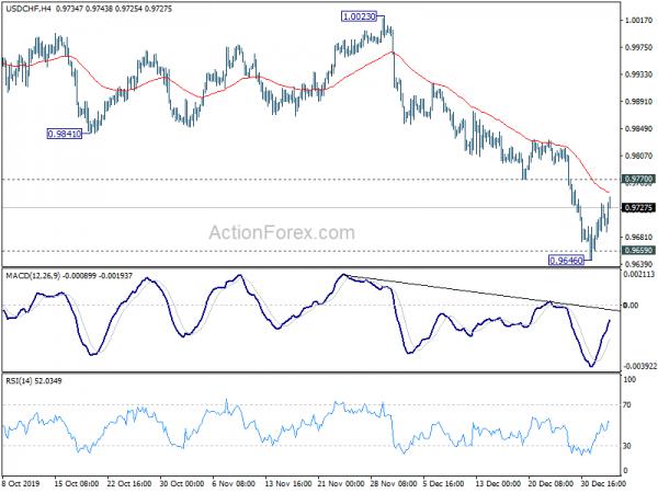 Intraday bias in USD/CHF remains neutral for consolidation above 0.9646. Further decline is in favor as long as 0.9770 support turned resistance holds. Break of 0.9646 will target 0.9541. Nevertheless, on the upside, break of 0.9770 will indicate s