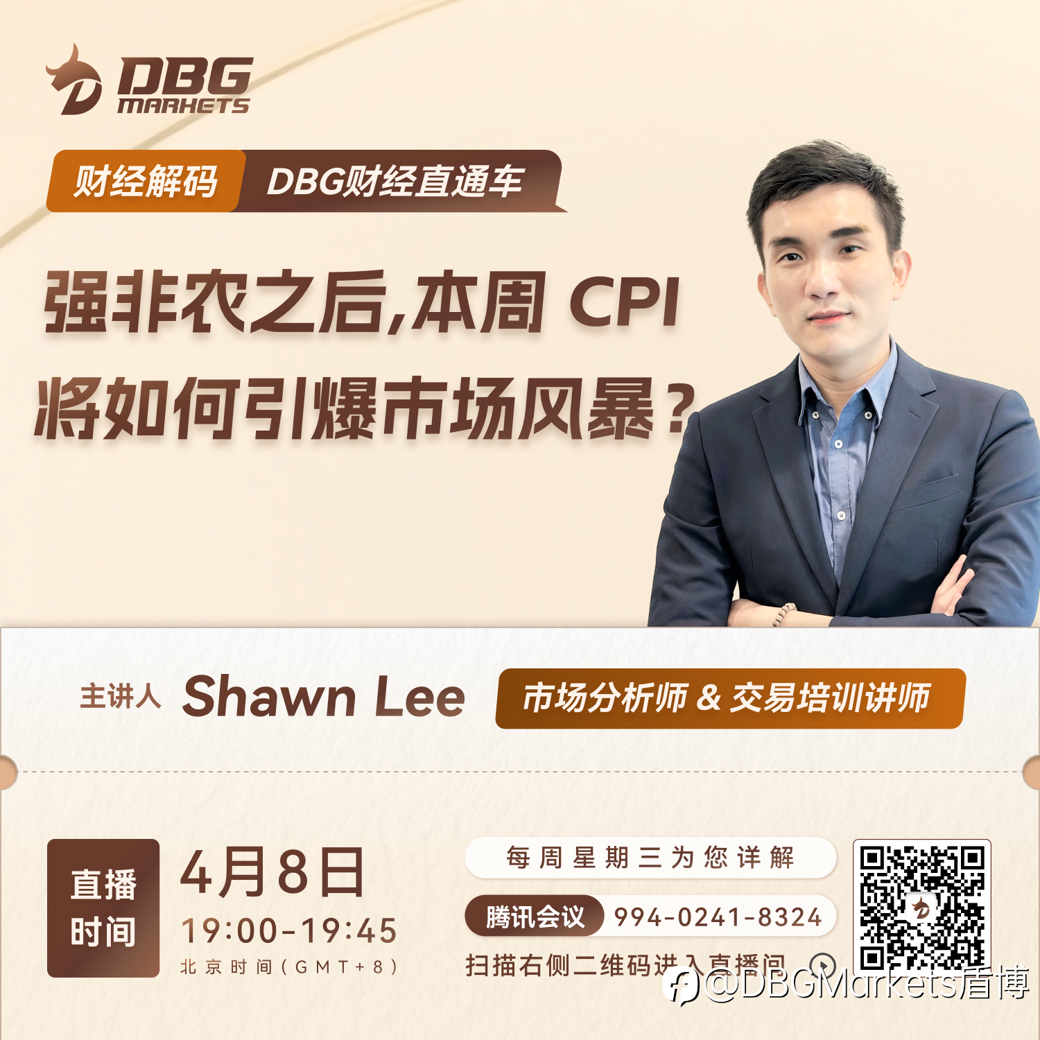 📡 【 财经解码 · DBG财经直通车 】 大家好,本周DBG Markets财经直播又如期而至啦!感谢您的持续关注。 强劲的非农数据刚刚震撼市场,通胀考验却紧随其后。CPI 的登场不仅是对美国经济的再一次检验,更可能成为引爆全球市场风暴的导火索。美元与黄金的避险逻辑或将面临重新洗牌,投资者在数据与风险的交锋中屏息以待。究竟这是新一轮压力的延续,还是转机的开端? 📢 市场风向变幻莫测,投资者亟需清晰的判断与策略。 在波动加剧的行情中,如何看懂趋势、稳健布局?我们为您解码! 🎯 每周三 DBG Markets特别邀请资深市场分析师 & 交易培训讲师, 为你深