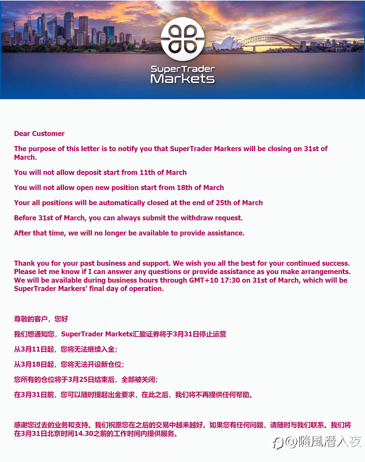 外汇市场是当今全世界最大的金融市场,每时每刻在世界各地都有交易者在做外汇交易。随着经济发展,外汇交易逐渐走进我们的生活中,成为一种常见的投资行为,而各种外汇交易平台也如雨后春笋般出现。而交易平台便是十分重要的交易媒介,它关乎用户的交易体验。 侦查君今天在社区发现一张用户分享的图片 :“SuperTrader Markets汇盈在线关门大吉。”#SuperTrader Markets汇盈证券# 停止运营背后到底是什么?欢迎大家跟侦查君一起探讨。 汇盈证券怎么样? 汇盈证券,是由SuperForex Financial Pty Ltd汇通金融集团全资拥有的一家多资产交易平台(Multiple As