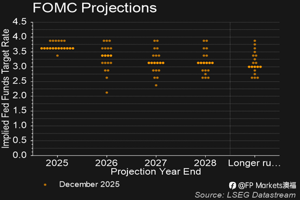 #FPMarkets澳福# 昨天,美联储的决定成为焦点。正如市场普遍预期,美联储在2025年最后一次会议上将目标利率区间下调至3.50%-3.75%,这是今年以来的第三次降息,也是自2024年底美联储宽松周期开始以来累计降息175个基点。 尽管降息符合普遍预期,但这一决定并非全票通过,有三位美联储理事投了反对票。美联储理事斯蒂芬·米兰选择大幅降息50个基点,堪萨斯城联储主席杰夫·施密德则投票维持利率不变——这并不令人意外。然而,芝加哥联储主席奥斯坦·古尔斯比也加入了施密德的行列,选择维持利率不变(9比3的投票结果),这着实令人惊讶。您可能还记得,美联储会议上上