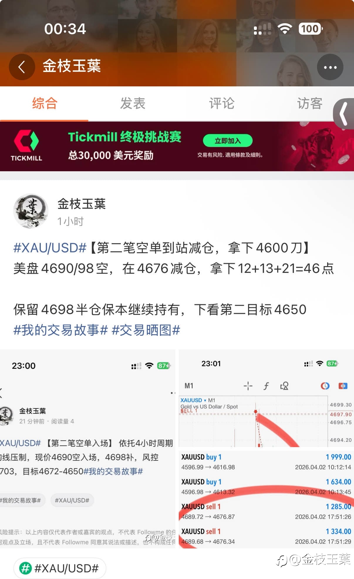【4/3周四结束】 今日结束,整体拿下126点 4597多,在4616/13止盈,拿下20+16=36点(提前止盈,可惜没能最大化) 4690/98空,分别在4676/4654止盈,拿下13+13+21+43=90点 周三行情受消息...