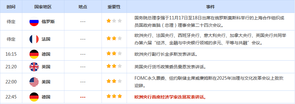 CWG Markets市场资讯2025年11月17日(周一): 汇讯摘要: 上周五,随着美联储降息预期消退,美元指数小幅反弹,最终收涨0.087%,报99.27;美债收益率普遍收涨,基准的10年期美债收益最终收报4.147%,对美联储政策利率敏感的2年期美债收益率收报3.612%。 上周金价冲高回落,周初开盘时,金价强势站稳4000美元关口,投资者们满心期待着新一轮的狂飙突进,并一度向上个月创下的历史新高发起冲击,最高触及4245美元附近。然而,随着美联储官员接二连三的鹰派言论如惊雷般炸响,市场情绪瞬间逆转,现货黄金在上周五暴挫近2%,收于4085美元/盎司附近。 由于乌克兰无人机