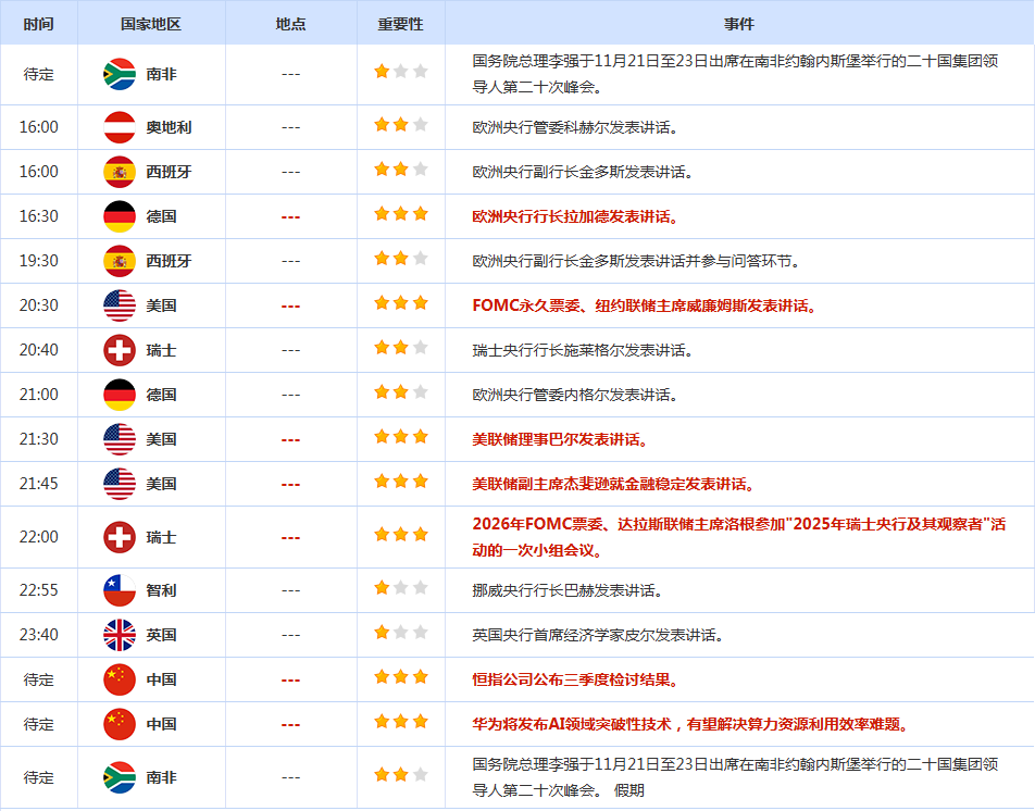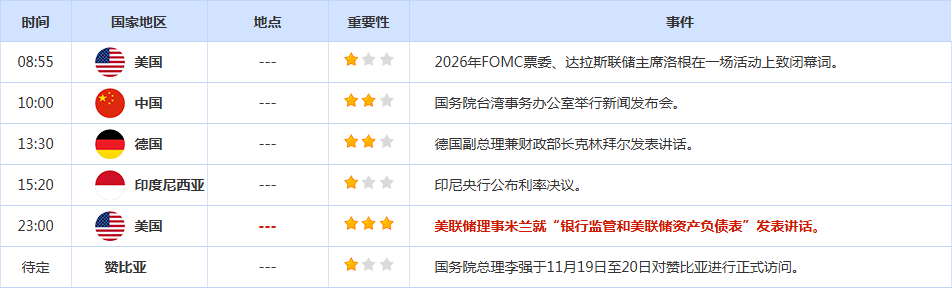 CWG Markets市场资讯2025年11月19日(周三): 汇讯摘要: 周二,受疲软的美国就业数据拖累,美元指数盘中下挫,但在科技股抛售潮中保持坚挺,最终收涨0.072%,报99.61;美债收益率有所回落,基准的10年期美债收益最终收报4.113%,对美联储政策利率敏感的2年期美债收益率收报3.585%。 周二(11月18日)出炉的美国最新就业数据全面崩盘,直接把美联储12月降息预期从谷底拉回50%附近,现货黄金从盘盘中触及的一周低点3998美元暴力反弹,盘中最高摸到4080美元,最终收涨0.54%报4067.44美元,一夜终结三连阴,上演“王者归来”戏码!本交易日市场目光将转向