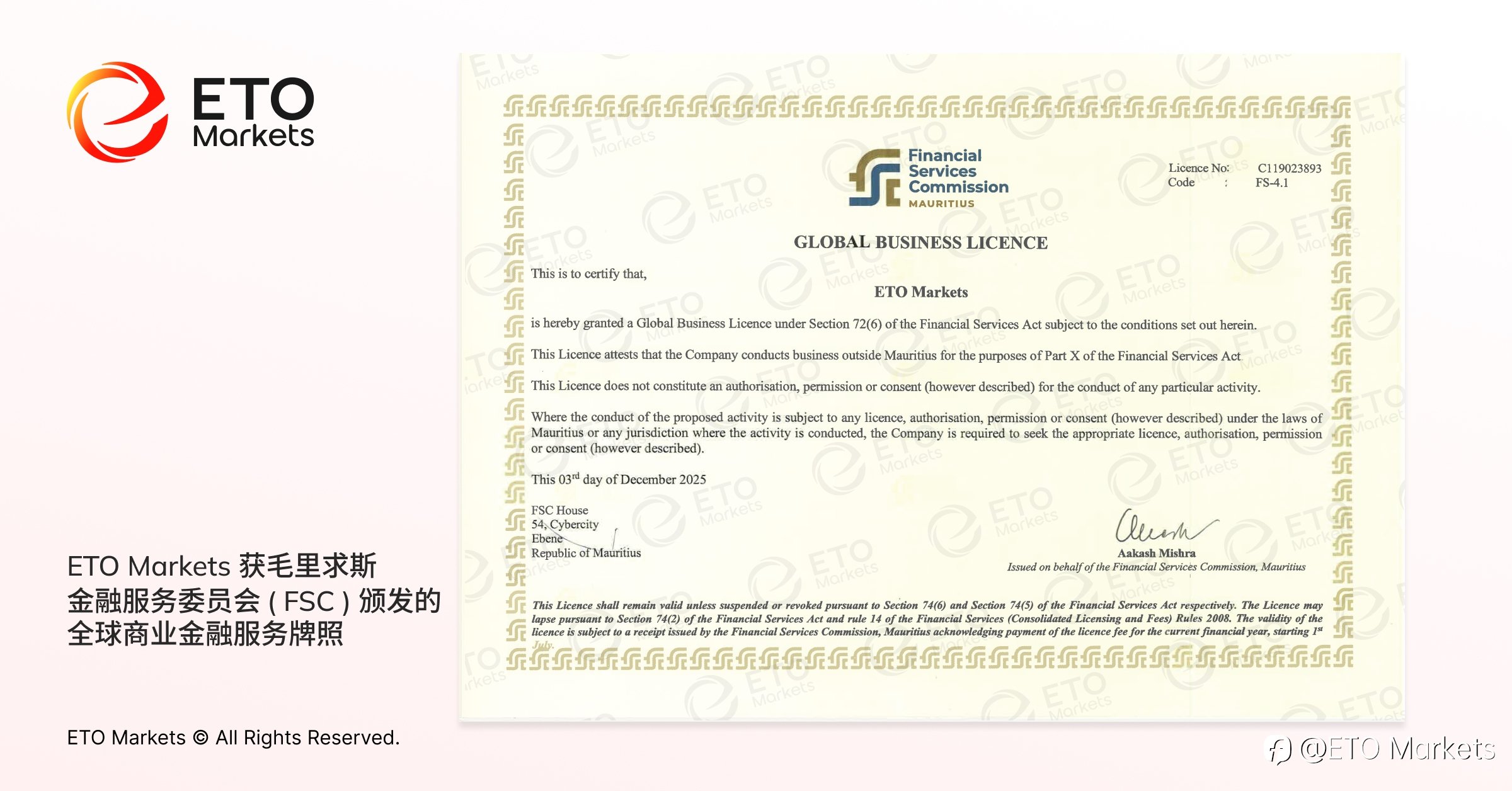 ETO Markets 宣布已获得毛里求斯金融服务委员会(FSC)颁发的金融服务牌照(牌照编号:C119023893)。此监管许可进一步巩固了平台在透明运营、稳健合规与客户保障的承诺,更标志着ETO Markets 在全球化与智能交易体系建设上的持续推进。 寰宇布局,步履从容 毛里求斯 FSC 牌照的取得体现了 ETO Markets 坚持最高监管标准的承诺。平台以澳大利亚为总部,致力于为全球客户提供安全、创新且以客为尊的交易解决方案。此监管授权与平台现有的澳大利亚 ASIC 与塞舌尔 FSA 牌照交相辉映,进一步巩固其跨区域、多维度的国际合规框架,为全球客户打造更稳健的交易保障体系。 合规为