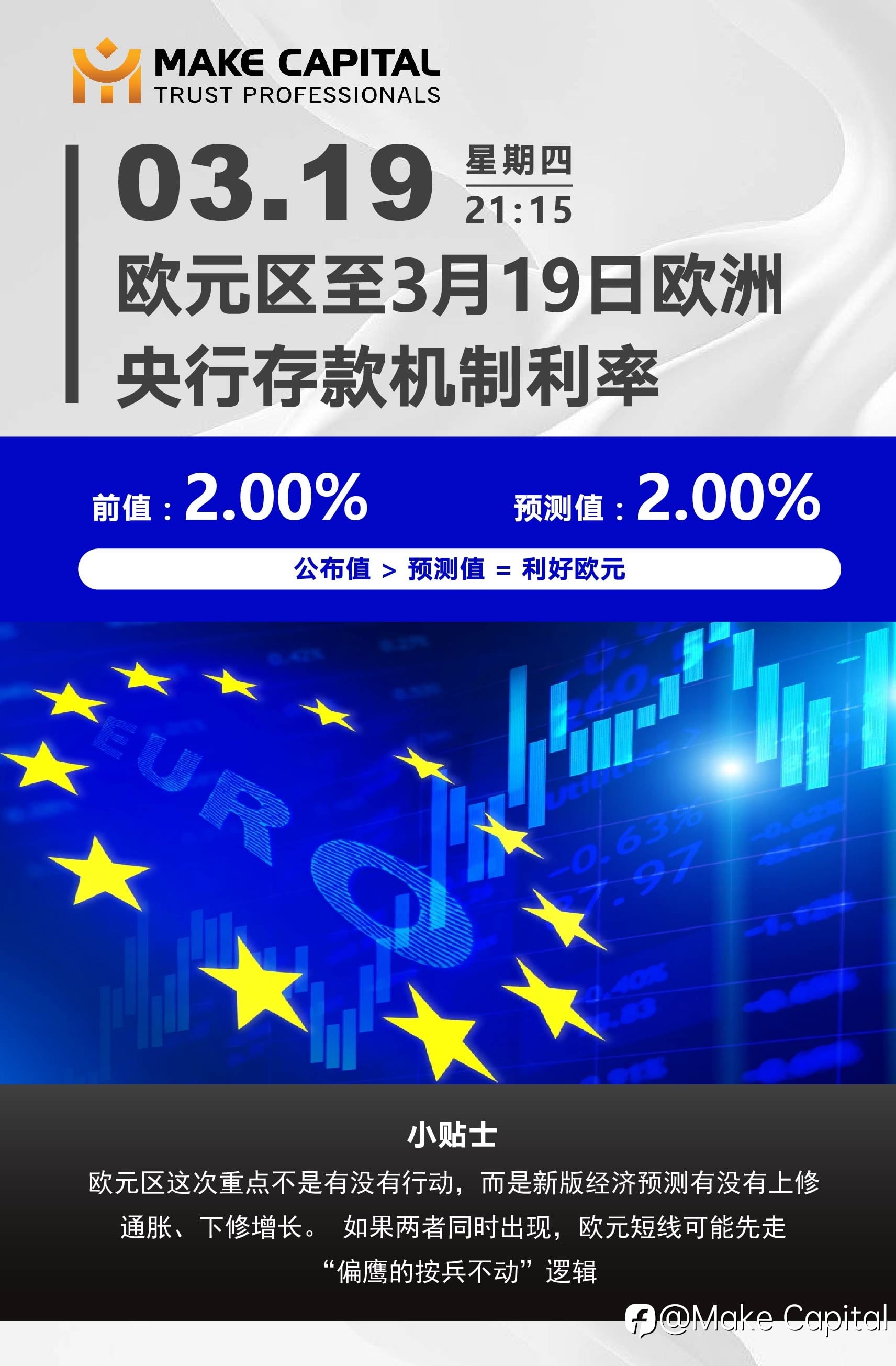 欧元关键利率公布|市场即将迎来方向选择 03月19日(周四)21:15 欧元区存款机制利率 前值:2.00% 预测值:2.00%
