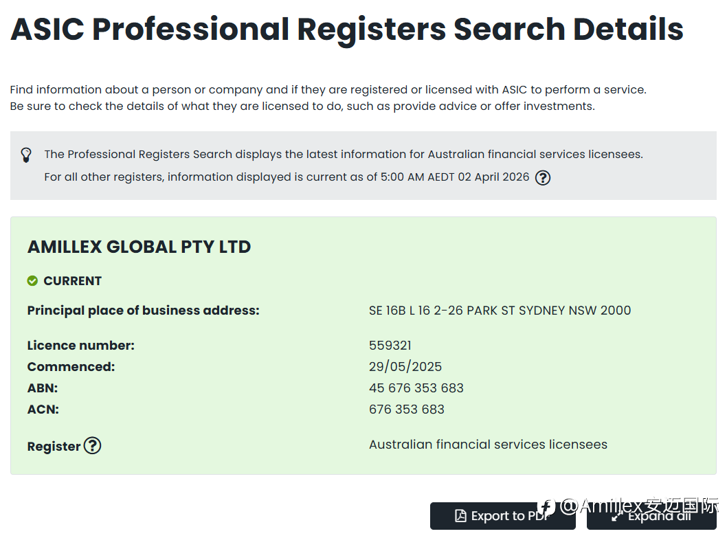 在当今瞬息万变的全球宏观经济中,无论是机构投资者还是个人交易者,面对林林总总的交易平台,“合规性”始终是衡量平台可靠性的唯一硬指标。作为在澳洲悉尼深耕多年的 Amillex 安迈国际,我们深知:信任是一切交易的起点。 今天,我们要做的不仅仅是展示品牌,更要教您如何像专业分析师一样,通过澳大利亚官方渠道,验证 Amillex 的核心身份——AFSL 持牌金融机构。 一、 为什么 AFSL 牌照被视为全球金融监管的“黄金标准”? 许多投资者常问:“为什么一定要选受 ASIC 监管的平台?” 澳大利亚证券和投资委员会(ASIC)不仅是澳洲金融市场的守门人,更是全球公认的最严苛的金融监督机构之一。持有