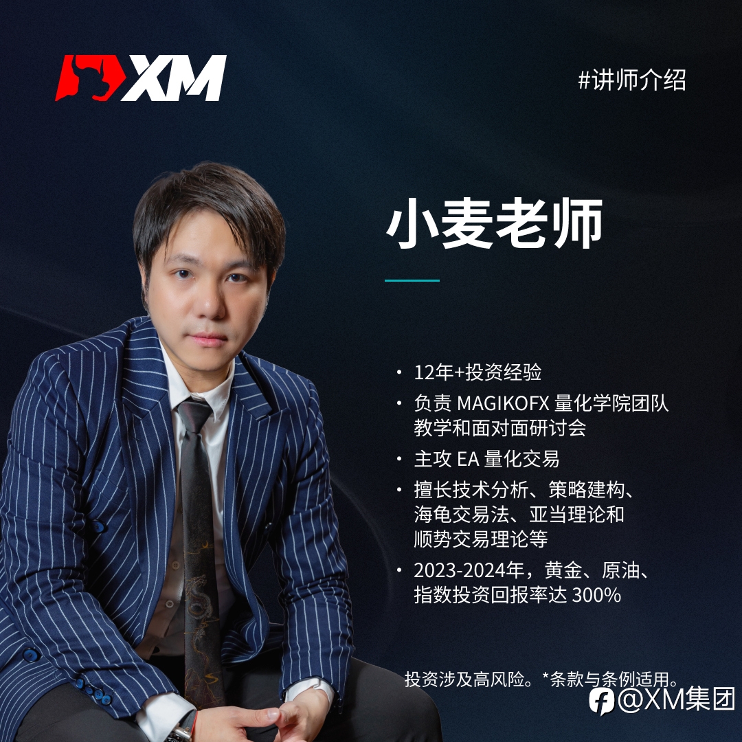 XM 扩充智囊团!小麦老师带你领略外汇新视界! 小麦老师拥有12年的外汇交易经验,是一位经验丰富的专业交易员和外汇讲师。他主要负责MAGIKOFX量化学院团队的教学和面对面研讨会,并担任私人VIP理财顾问和各大商会特约讲师。 在2010年至2019年期间,小麦老师由原本的主观交易转向主攻EA量化交易。他奉行“无法量化的策略,就无法被准确传承”的教育理念,擅长用数据说话,并且熟用技术分析,策略构建,海龟交易法,亚当理论,顺势交易理论等。 在2023年至2024 年期间,小麦老师在黄金、原油和指数上以量化交易获得了约300%的投资回报率,展现了其卓越的交易能力和成绩。他的加入将为XM团队带来更多专