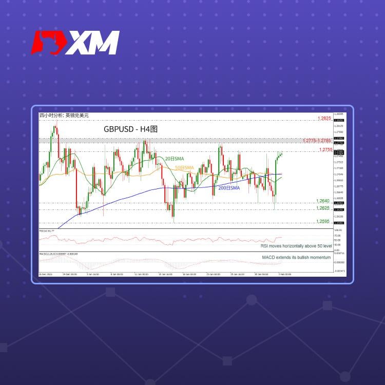GBPUSD维持在SMA上方 MACD和RSI显示看涨 前景呈中立 周四,GBPUSD自前期低点1.2625强劲反弹,突破简单移动平均线(SMA)后再次触及1.2755关键水平。 技术震荡指标显示,相对强弱指数(RSI)正在50中立水平上方区间震荡并小幅上升。异同移动平均线(MACD)指标正在红色信号线和零线上方加强看涨势头。 今日汇价若能突破前期高点1.2755,将加剧买盘情绪。继续上行,反弹或将触及1.2775-1.2785区间。若看涨力量持续增强,并且汇价突破12月28日高点1.2825,中立前景可能会转为看涨。 若汇价回落,则50日移动平均线(SMA)以及位于1.2706的200日移动