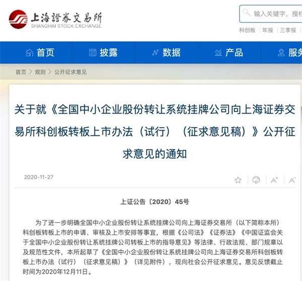 关于就《全国中小企业股份转让系统挂牌公司向上海证券交易所科创板转板上市办法(试行)(征求意见稿)》公开征求意见的通知 上证公告〔2020〕45号 为了进一步明确全国中小企业股份转让系统挂牌公司向上海证券交易所(以下简称本所)科创板转板上市的申请、审核及上市安排等事宜,根据《公司法》《证券法》《中国证监会关于全国中小企业股份转让系统挂牌公司转板上市的指导意见》等法律、行政法规、部门规章以及规范性文件,本所起草了《全国中小企业股份转让系统挂牌公司向上海证券交易所科创板转板上市办法(试行)(征求意见稿)》(详见附件),现向社会公开征求意见。意见反馈截止时间为2020年12月11日。 有关意见或建议可