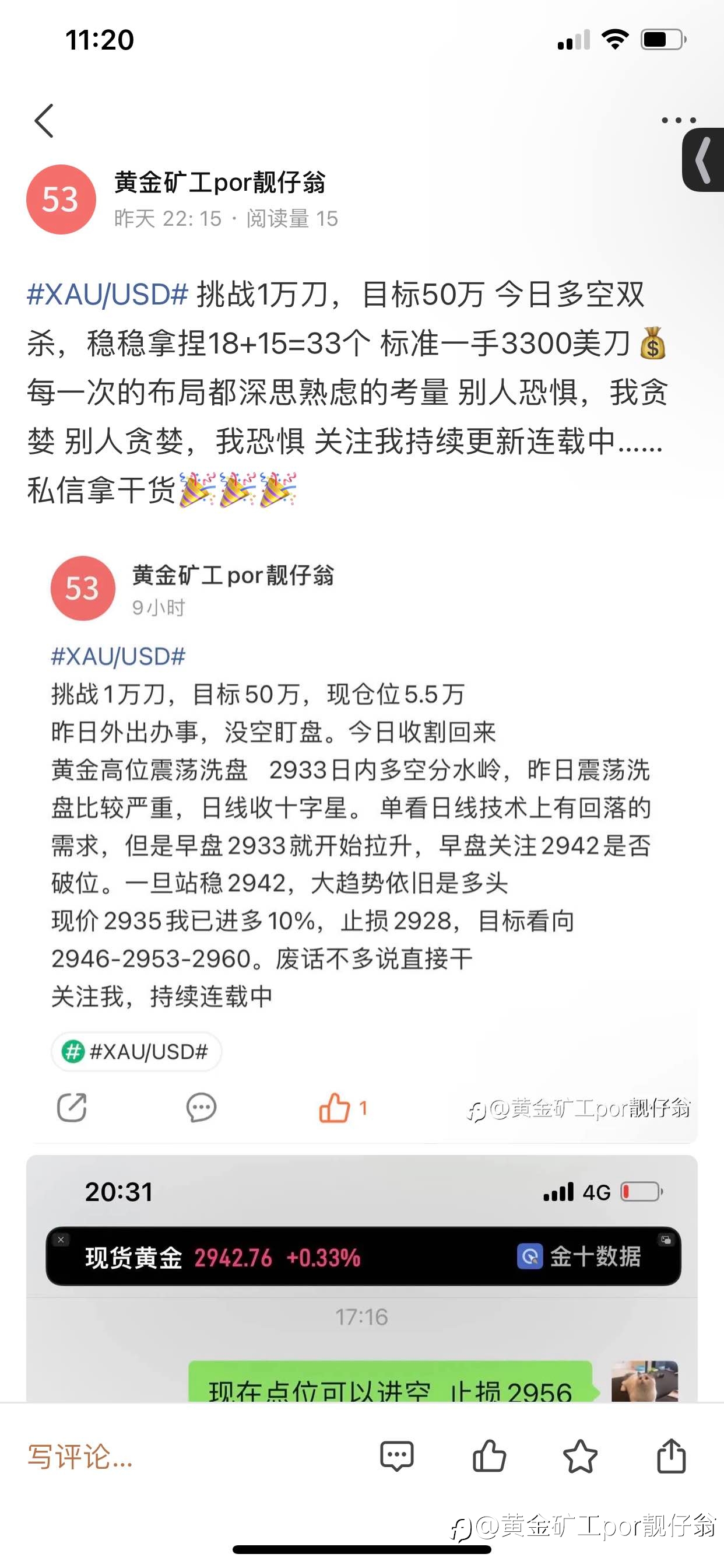 挑战1万刀,目标50万 继上周收获69个,开启本周第一单 现价2933我已进多10% ,止损2927。 目标看向2941-2950-2960 关注我持续更新连载中