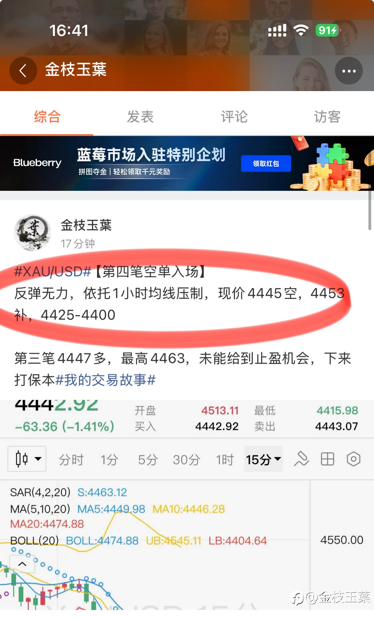【第四笔空单全部止盈离场,拿下4000刀】 欧盘4445空,分别在4425/4424止盈离场,拿下20+21点 目前15分钟小周期筑底,有反弹信号,预防底仓回撤打保本,底仓先落袋为安。 第五笔:上方关...