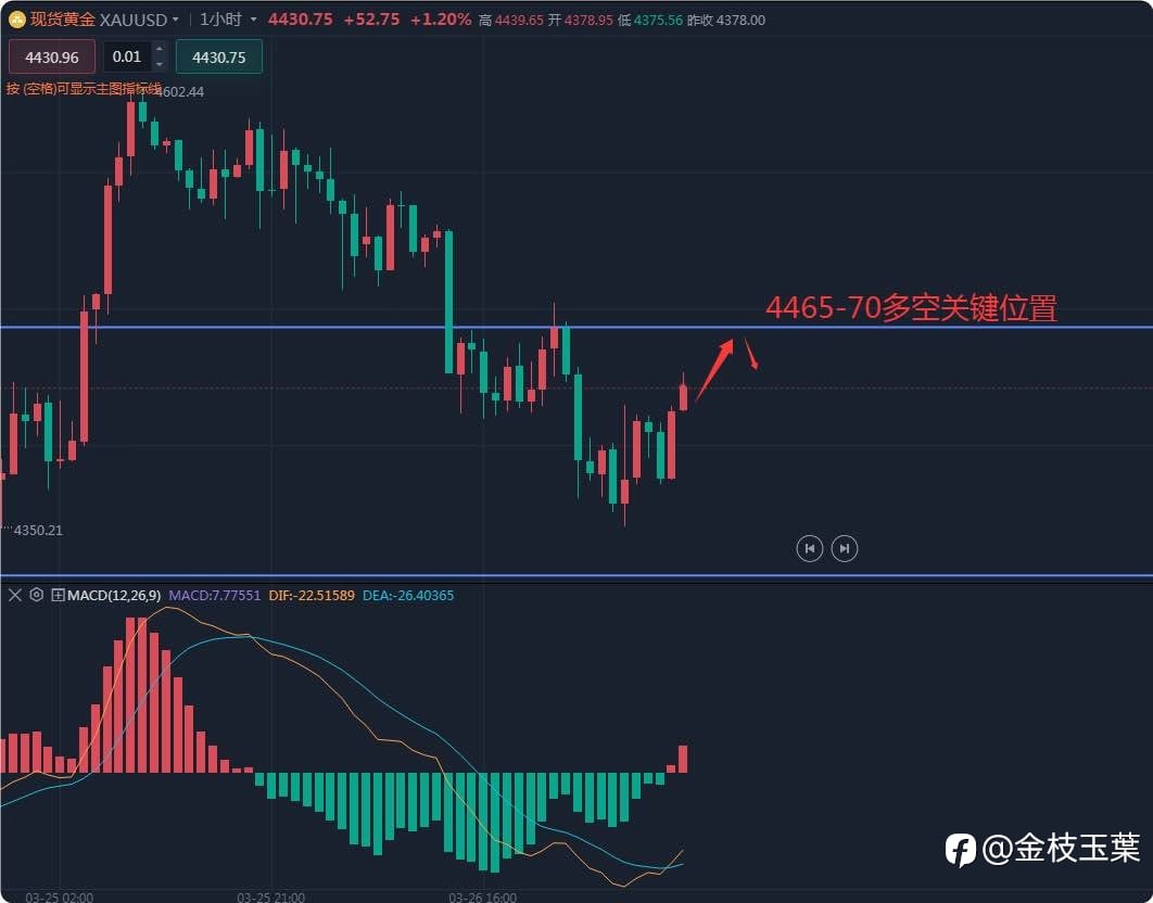 【3/27】 地缘政治美伊谈判要求超出双方接受的范围,目前看就停火谈判达成可能性很低。 昨日金价回落最低4351,目前4小时级别横向宽度收口,金价维持在中轨下方运行,均线交汇死叉,整体下...
