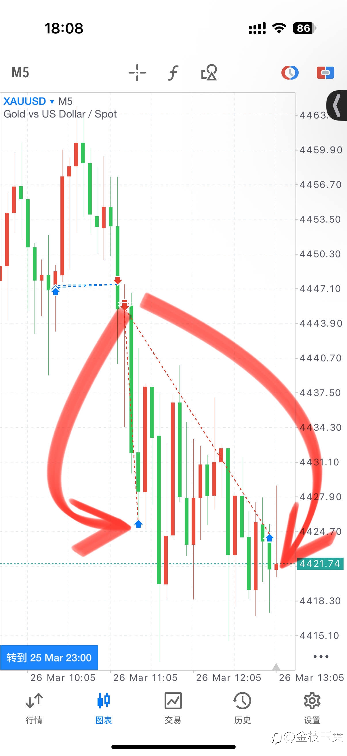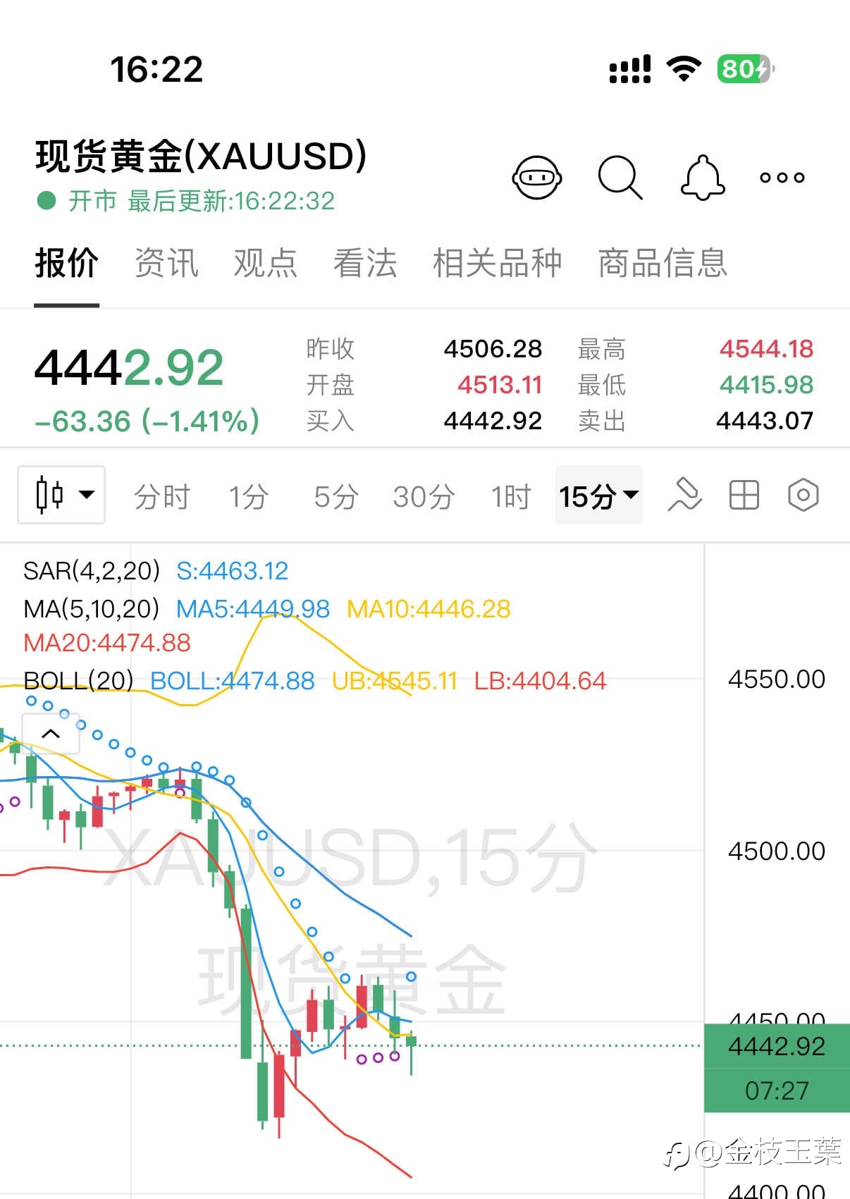 【第五笔多单入场】 依托15分钟均线拐头交汇金叉,现价4425多,风控4413,目标4443-4463