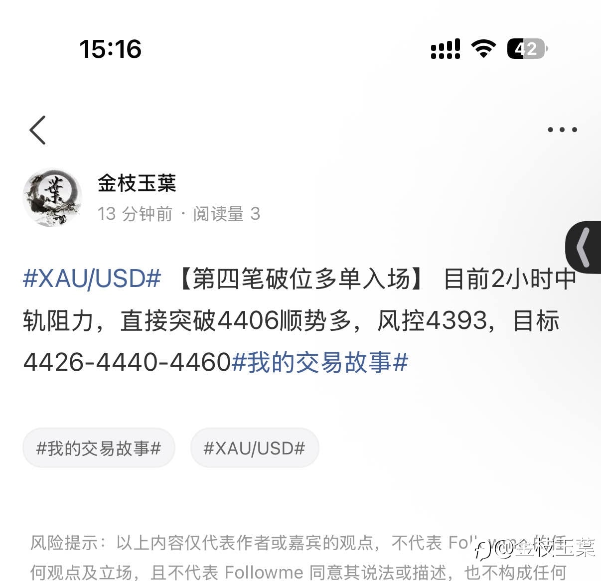 【第三笔多单入场】 依托15分钟均线金叉,现价4361多,4352补,风控4347,目标4381-4400