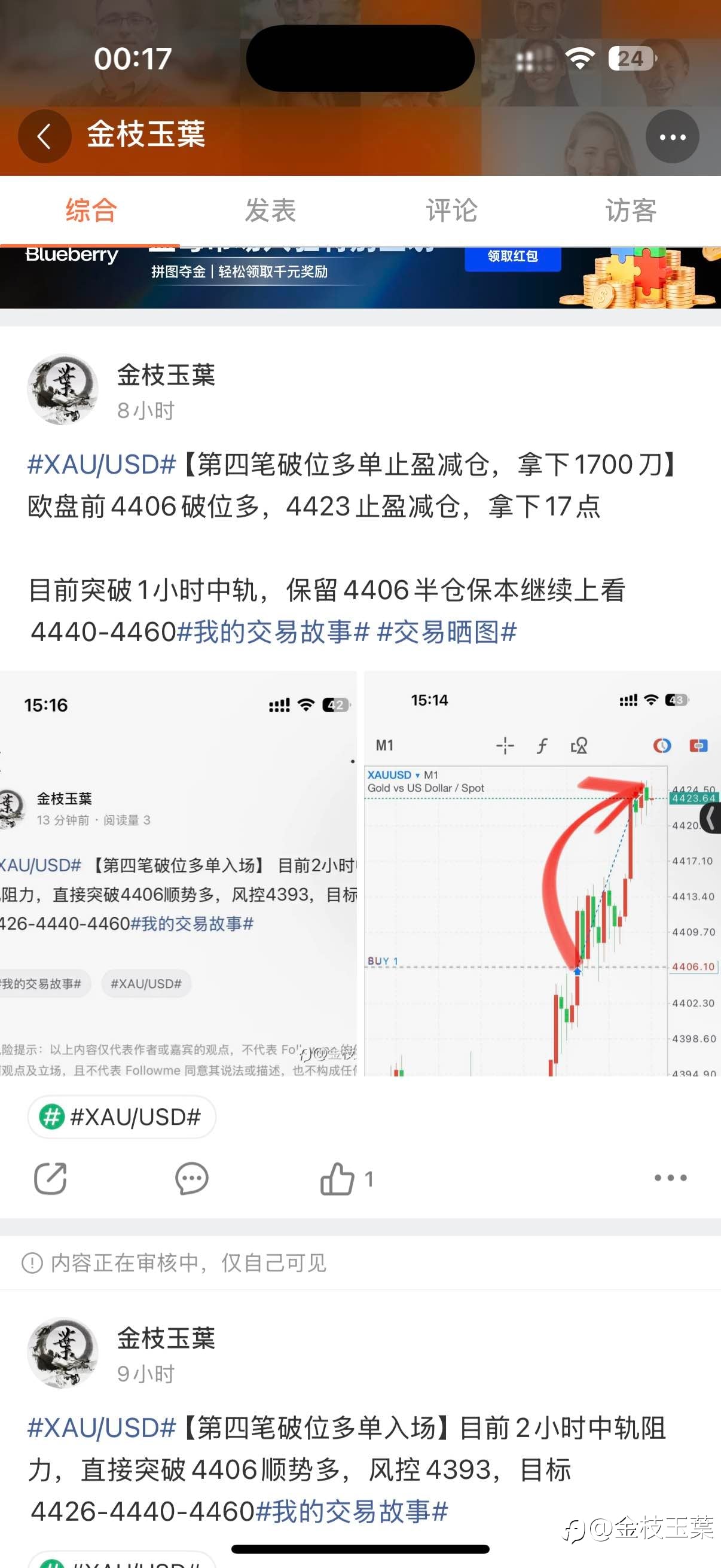 【第四笔破位多单止盈减仓,拿下1700刀】 欧盘前4406破位多,4423止盈减仓,拿下17点 目前突破1小时中轨,保留4406半仓保本继续上看4440-4460