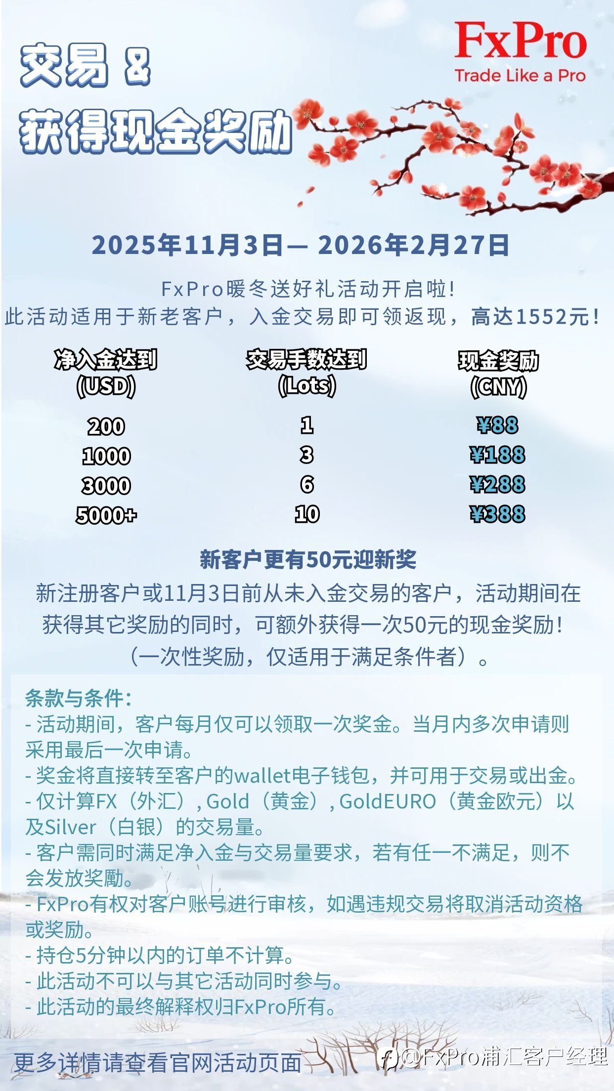 应广大客户反馈,时隔大半年的返现活动,我们决定重启啦! 活动期间净入金+交易量同时达到要求后,即可获得现金奖励! 新客更有50元迎新奖 新注册客户或11月3日前从未入金交易的客户,活动期间在获得其它奖励的同时,可额外获得一次50元的现金奖励!(一次性奖励,仅适用于满足条件者)。 为什么参与此活动? ✦操作简单——仅需入金和交易即可 ✦适用于新老客户 ✦奖金可以用来交易或出金 ✦最高1552元等您拿 条款与条件: 注册地址为中国大陆,香港,台湾或澳门的FxPro客户。 此活动适用于所有激活的FxPro MT4,MT5或cTrader真实账户。 活动期间,客户每月仅可以