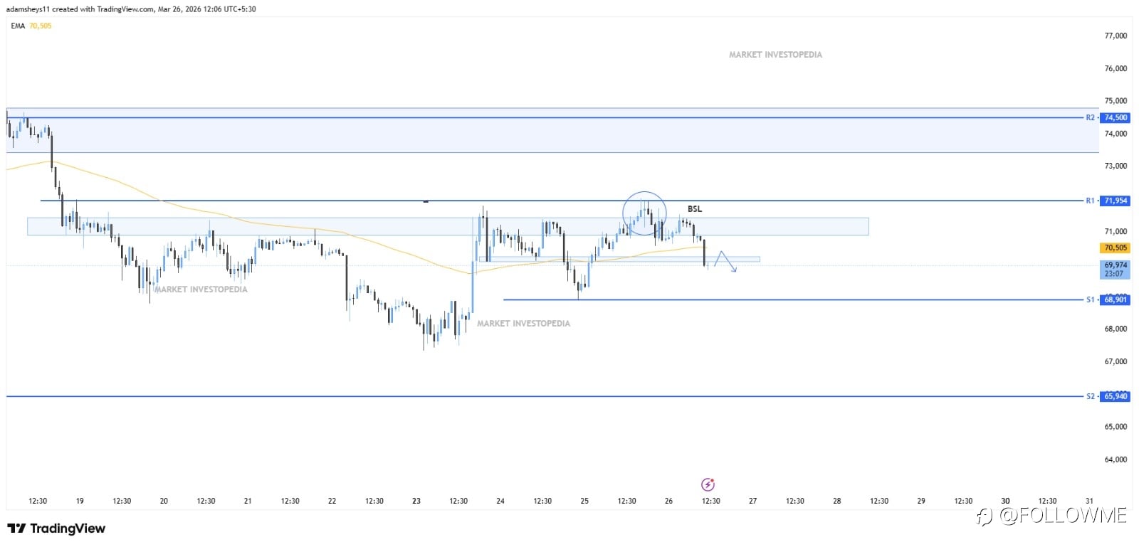 Bitcoin is currently showing rejection from a major supply zone, following a liquidity sweep near 72,000. This behavior suggests potential distribution activity, with sellers gradually defending higher levels. 📉 Market Structure • Market Type → Range-bound • Short-term Momentum → Bearish • Liquidit