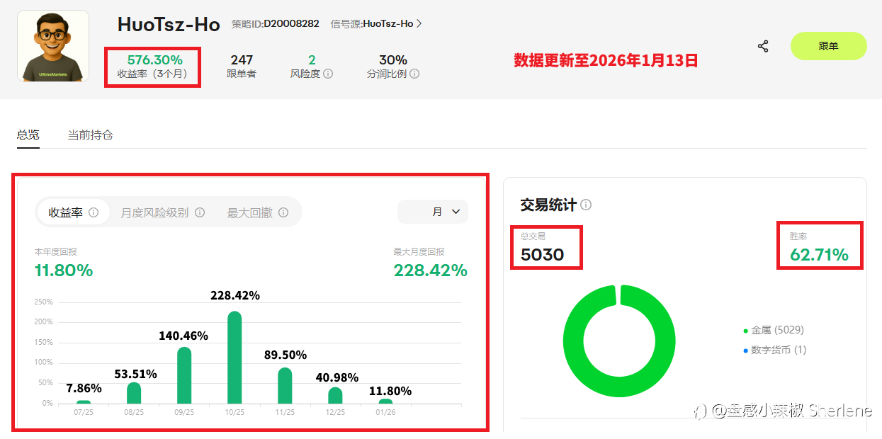 本月跟单市场延续「黄金策略领跑、风险分层配置」的趋势。 在市场波动加剧的环境下,黄金相关策略仍是主要收益来源;同时,回撤控制清晰、风控机制相对完善的稳健型策略,吸引更多偏好长期成长的投资人关注。 近30天数据显示,高收益策略虽具备亮眼成长潜力,但伴随较高波动;而趋势型与量化策略则以较稳定节奏运作,成为平衡投资组合的重要选项。 在XM跟单社区(Copy Trading),你可以根据自身风险偏好和交易风格,选择合适的交易策略,系统将自动操作,让你轻松跟单,无需盯盘,即可掌握市场节奏! 精选亮点: 黄金策略持续主导市场,月收益表现亮眼&