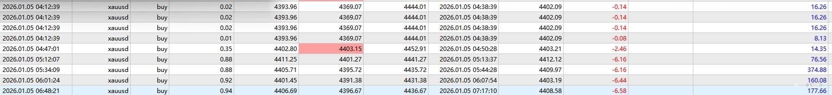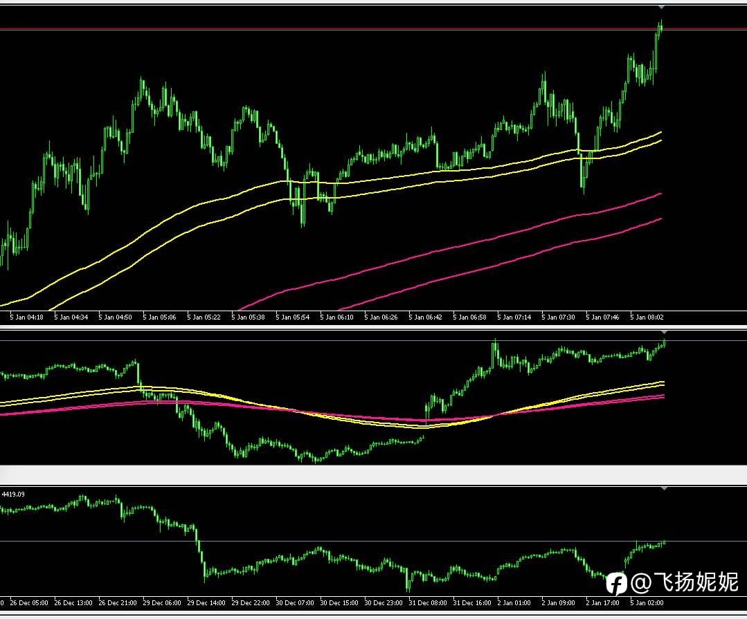 日内强势上涨符合上涨预期,我们日内思路无可挑剔,早盘即上涨如期高开低走老狮布局的多单也有所收获,午后老狮认为受地缘因素影响黄金或将持续上涨,给出4405一线多策略,最高4439,拿下25美刀,也算是给2026开好头,祝愿跟粉丝朋友一起马踏飞燕,马到成功! 技术面来看,当前行情存在超买信号,引发部分多头获利了结,且机构在4440关口附近出现大额抛售行为,多重因素叠加,对金价形成阶段性回调压制。 日内黄金震荡上行并突破前期高点,中途虽有回踩修正,但多头动能表现强劲,截至目前最高触及4440一线,当前围绕该位置震荡整理此点位与五件老狮预判的压制区间高度契合。 从技术面来看,日内上涨态势延