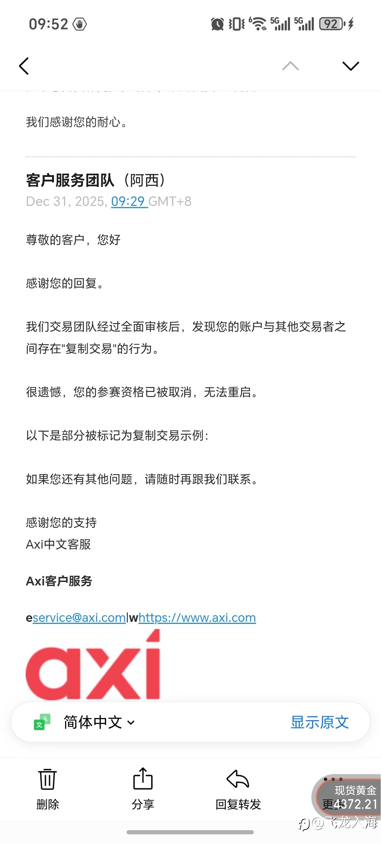 Axi平台太可耻了,持续盈利了就随便找个理由说我复制别人的交易(根据平台提供的数据证明显示我的几个单子跟别的交易员类似,只是进出场时间和价格差不多而已,而且每次的单子都是不同的交易员,交易员有各个国家的,就说我复制人家的交易),然后把我的7000美金分润直接清零了,还从加速阶段打回初始阶段,这平台太恶心了。